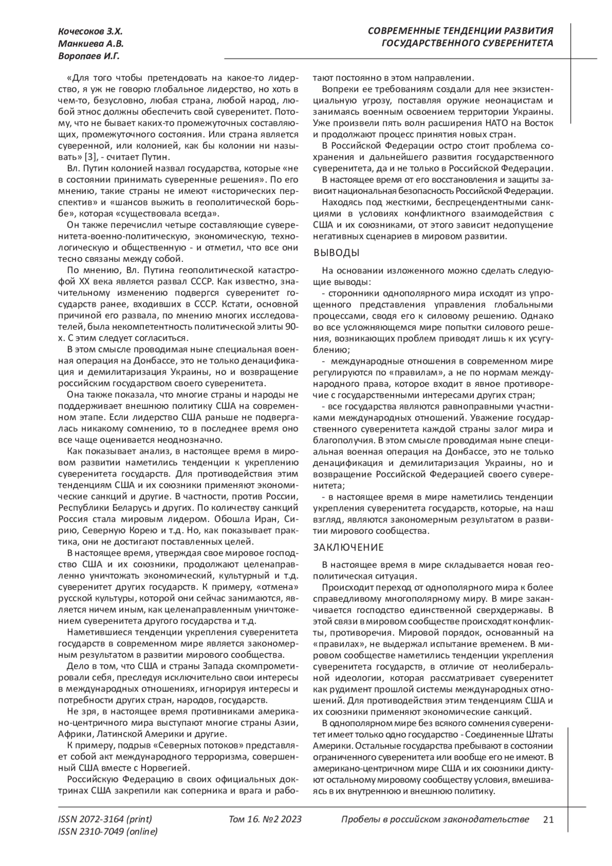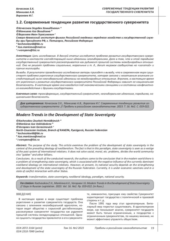 КОЧЕСОКОВ З. Х., МАНКИЕВА А. В., ВОРОПАЕВ И. Г. СОВРЕМЕННЫЕ ТЕНДЕНЦИИ РАЗВИТИЯ ГОСУДАРСТВЕННОГО СУВЕРЕНИТЕТА // ПРОБЕЛЫ В РОССИЙСКОМ ЗАКОНОДАТЕЛЬСТВЕ. 2023. Т. 16 № 2