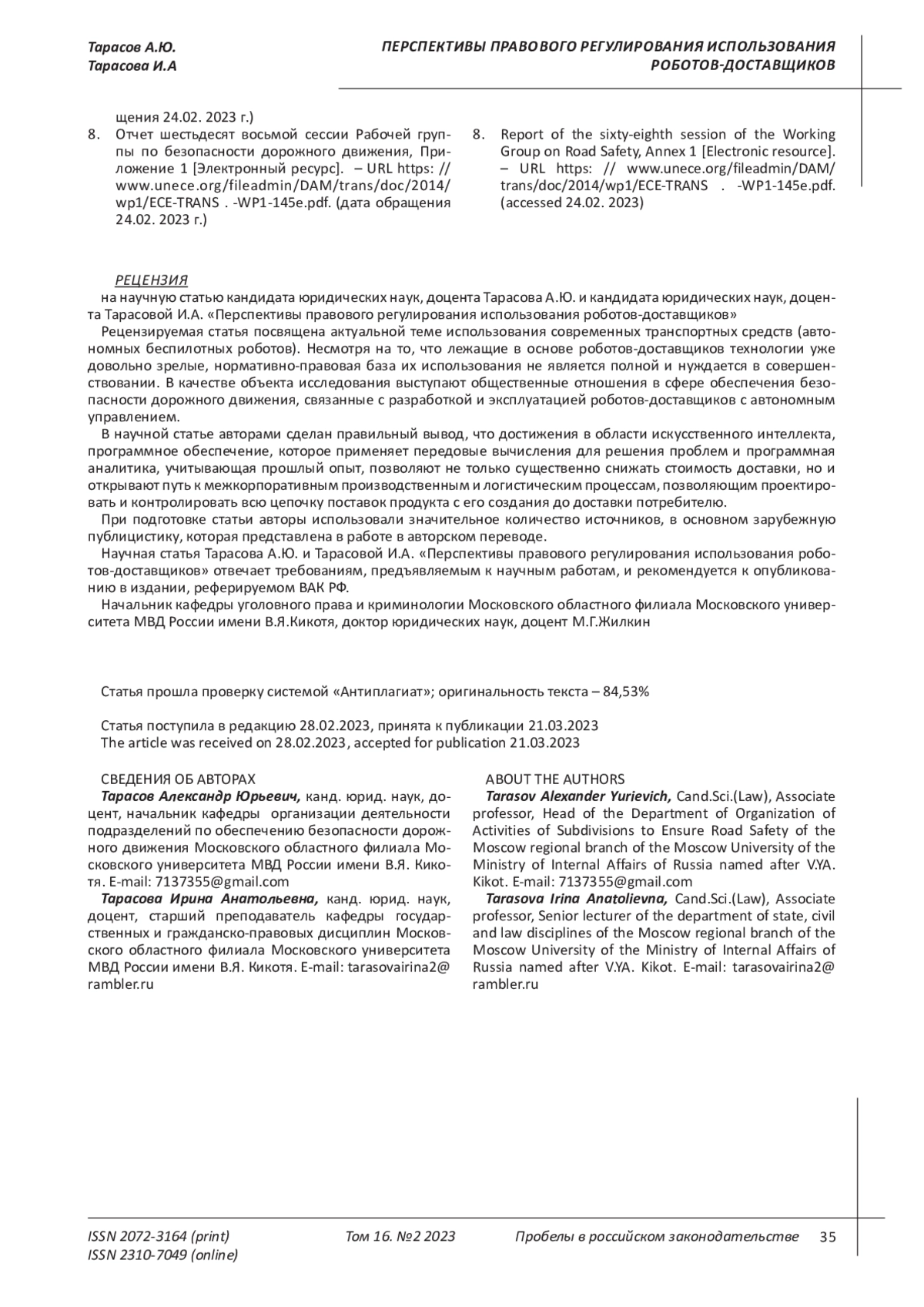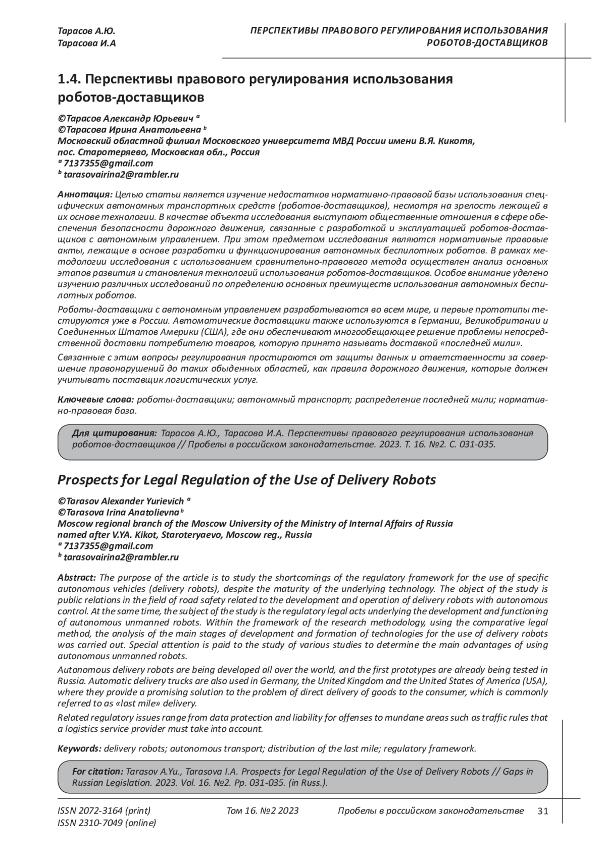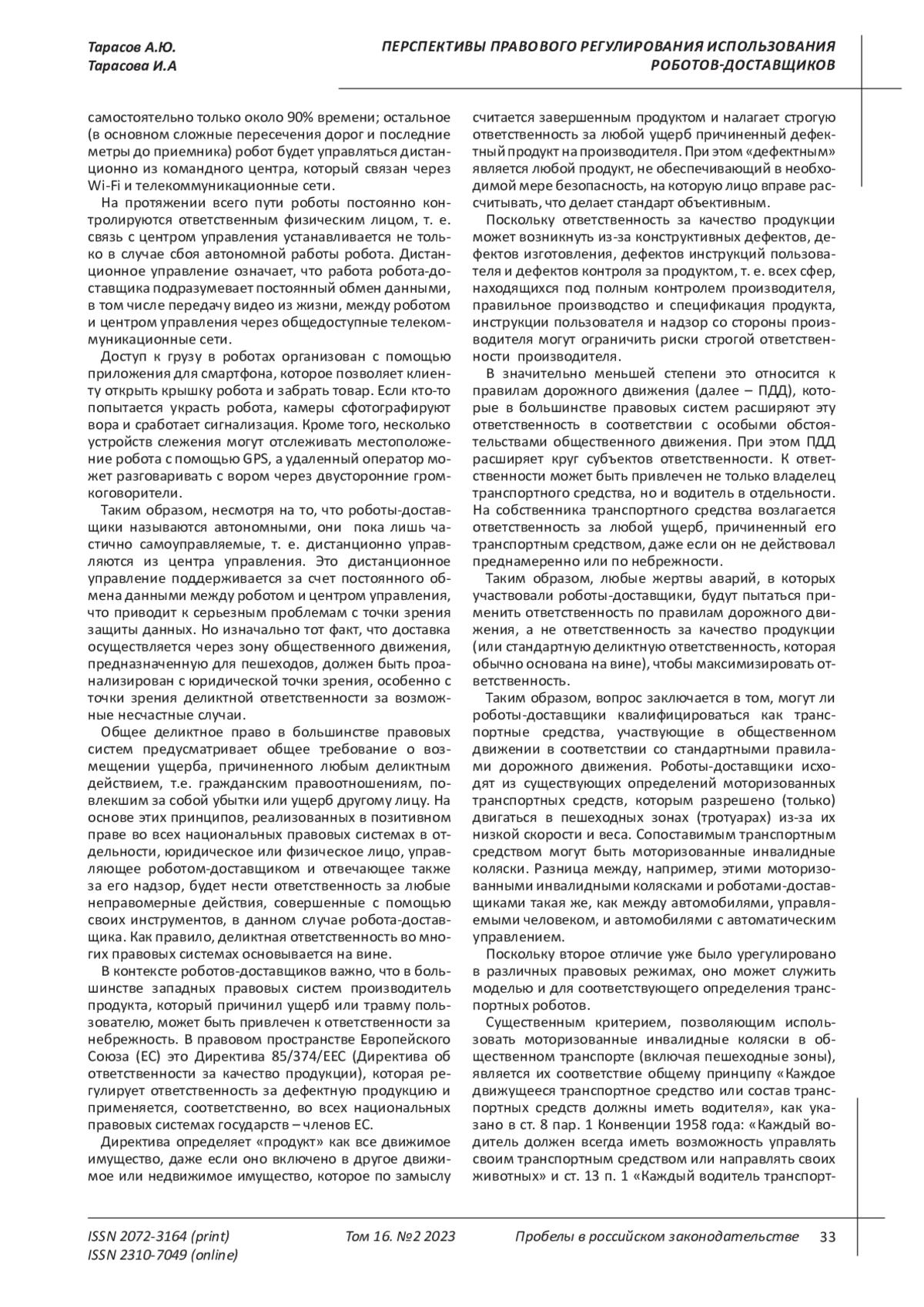 ТАРАСОВ А. Ю., ТАРАСОВА И. А. ПЕРСПЕКТИВЫ ПРАВОВОГО РЕГУЛИРОВАНИЯ ИСПОЛЬЗОВАНИЯ РОБОТОВ-ДОСТАВЩИКОВ // ПРОБЕЛЫ В РОССИЙСКОМ ЗАКОНОДАТЕЛЬСТВЕ. 2023. Т. 16 № 2