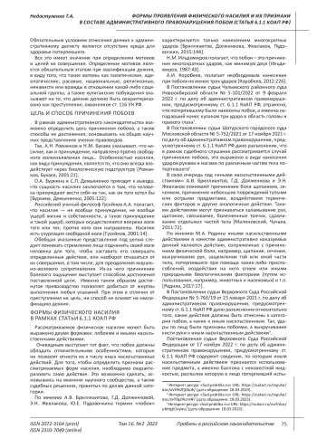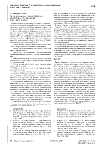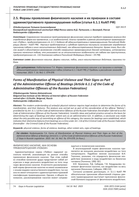 Rodina M.A. Composition of administratively punishable beatings and other actions of a violent nature // Bulletin of the Moscow University of the Ministry of Internal Affairs of Russia. 2017. No. 5. P. 77. EDN: ZQJEKP