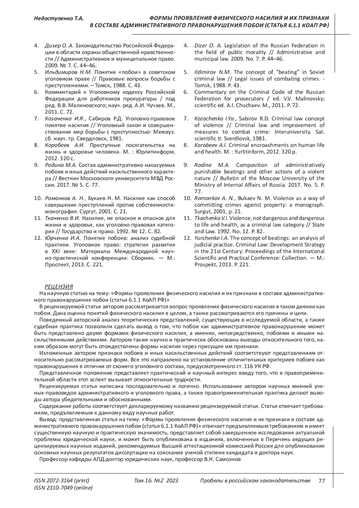 9. Родина М.А. Состав административно наказуемых побоев и иных действий насильственного характера // Вестник Московского университета МВД России. 2017. № 5. С. 77. EDN: ZQJEKP