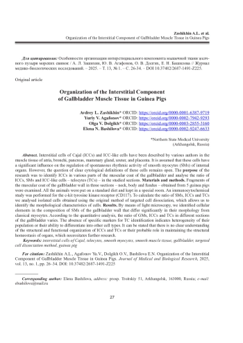 Результаты. В составе ГМ стенки желчного пузыря на светооптическом уровне удалось идентифицировать клеточные элементы, существенно отличающиеся по своей морфологии от классических миоцитов. Количественный анализ свидетельствует о том, что соотношение ГМ, ИКК и ТЦ варьирует в различных отделах желчного пузыря. Отсутствие специфических маркеров для идентификации ТЦ указывает на неоднородность их популяции или способность дифференцироваться в другие клеточные типы. Можно констатировать отсутствие четких представлений о структурно-функциональной организации ИКК, ТЦ и их вероятной роли в поддержании структурного гомеостаза органов, что обусловливает необходимость дальнейших исследований.