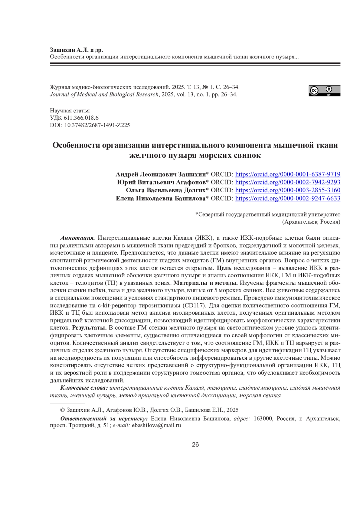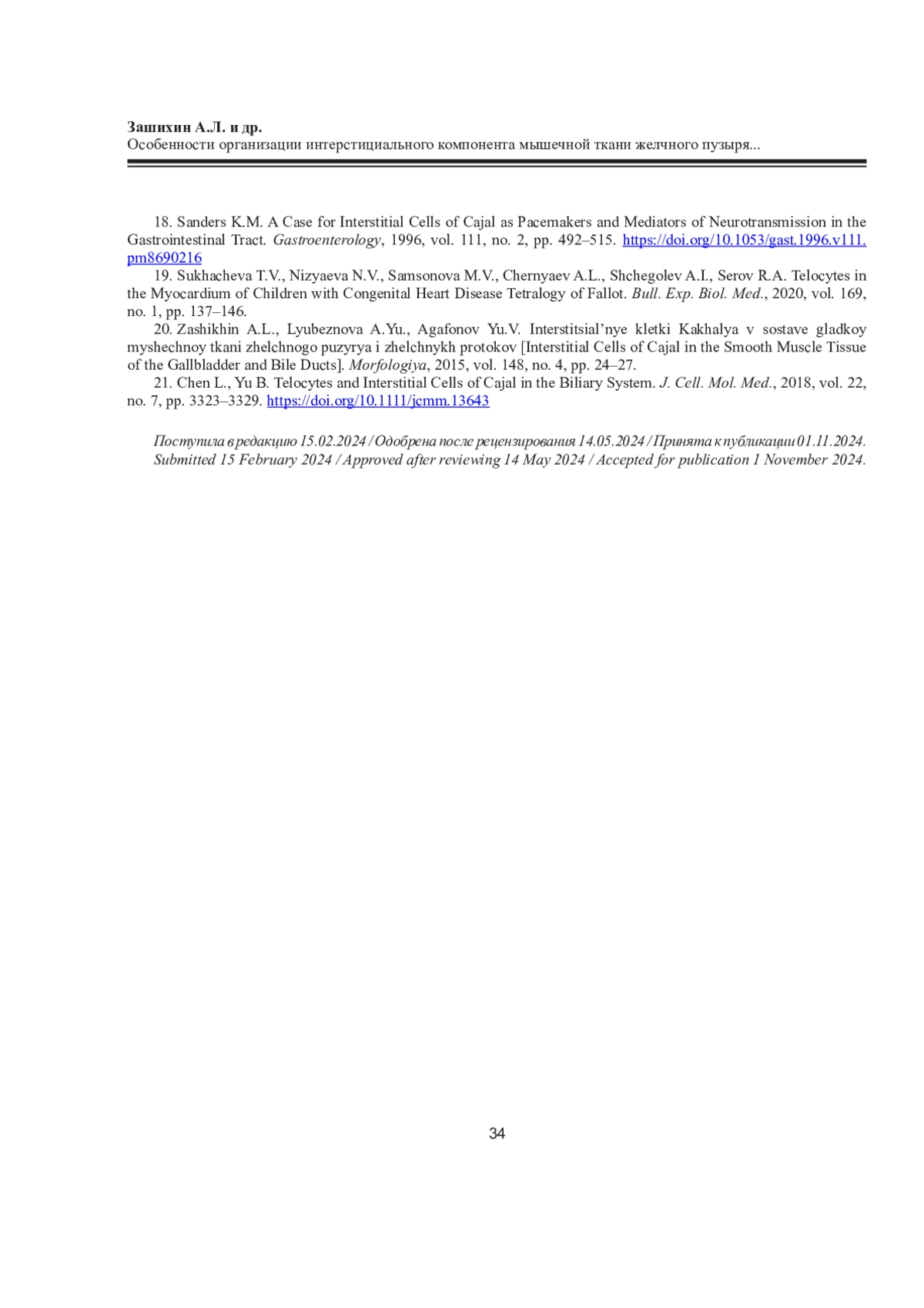 20. Зашихин А.Л., Любезнова А.Ю., Агафонов Ю.В. Интерстициальные клетки Кахаля в составе гладкой мышечной ткани желчного пузыря и желчных протоков // Морфология. 2015. Т. 148, No 4. С. 24-27. EDN: UDDTSV