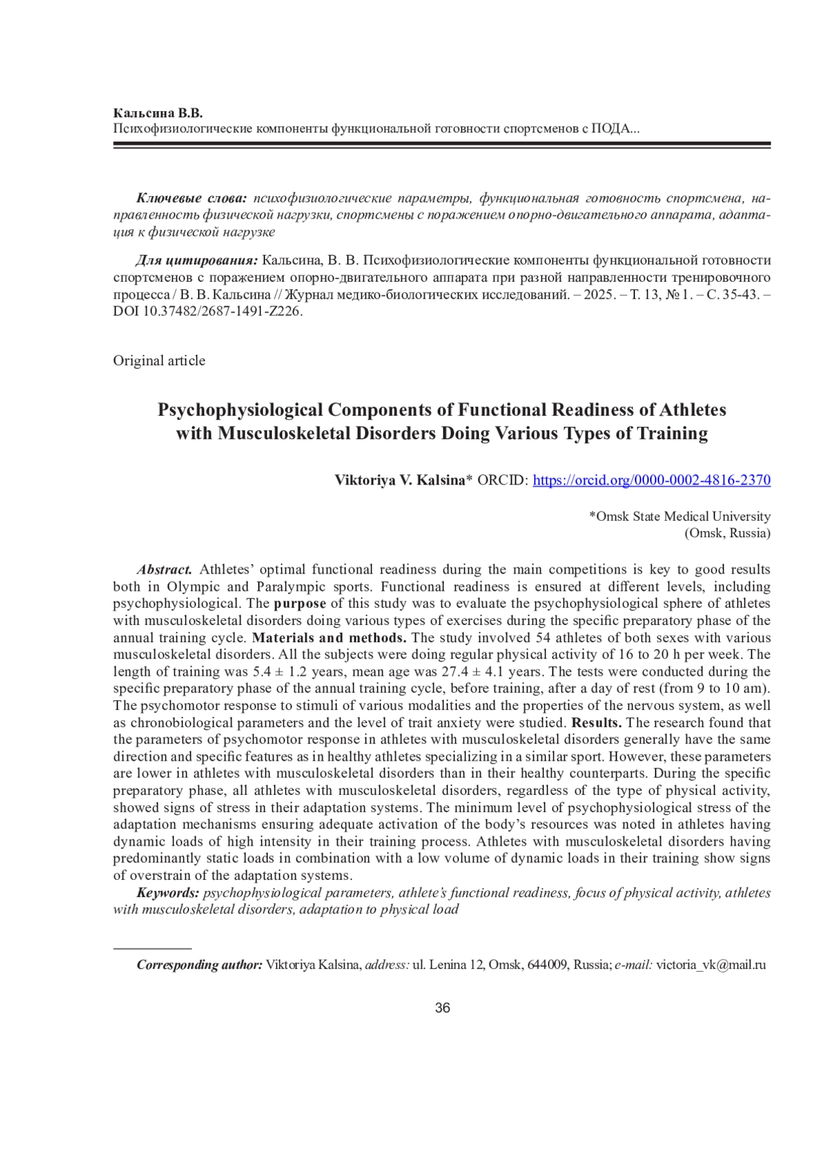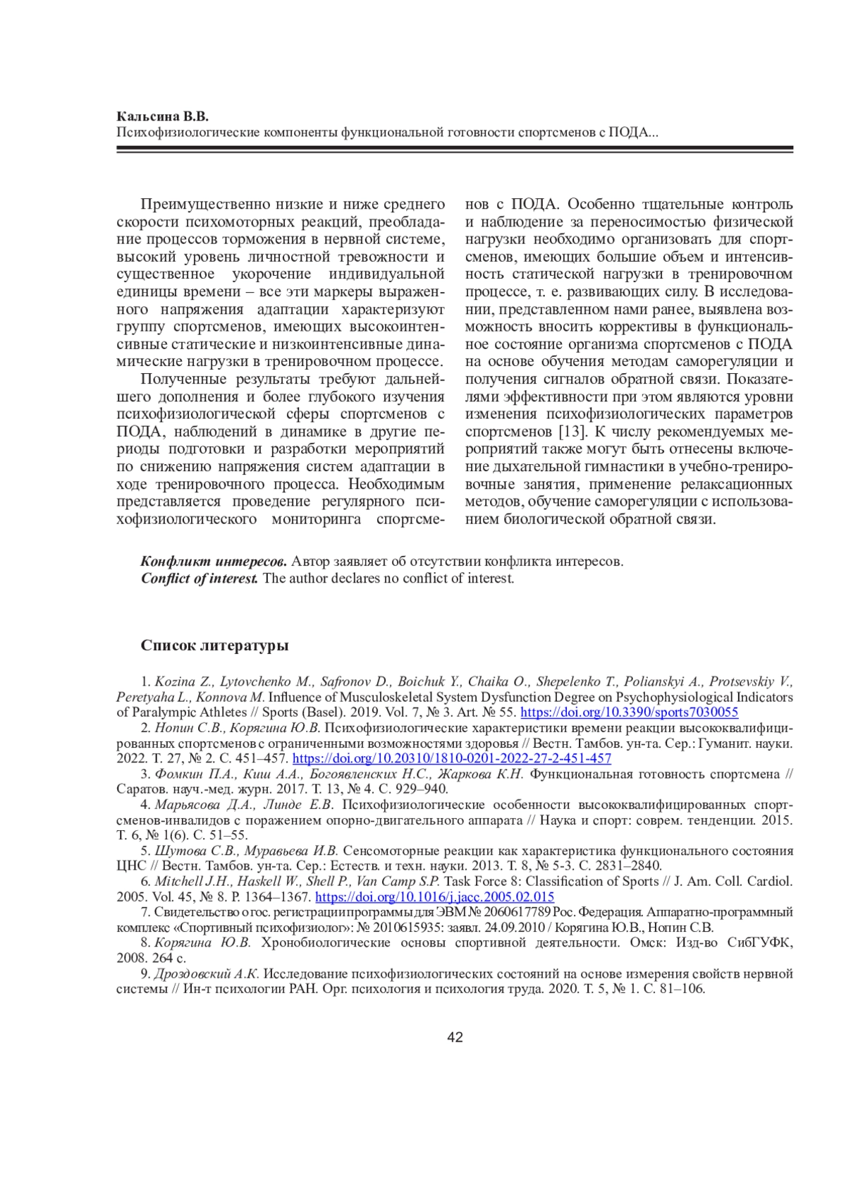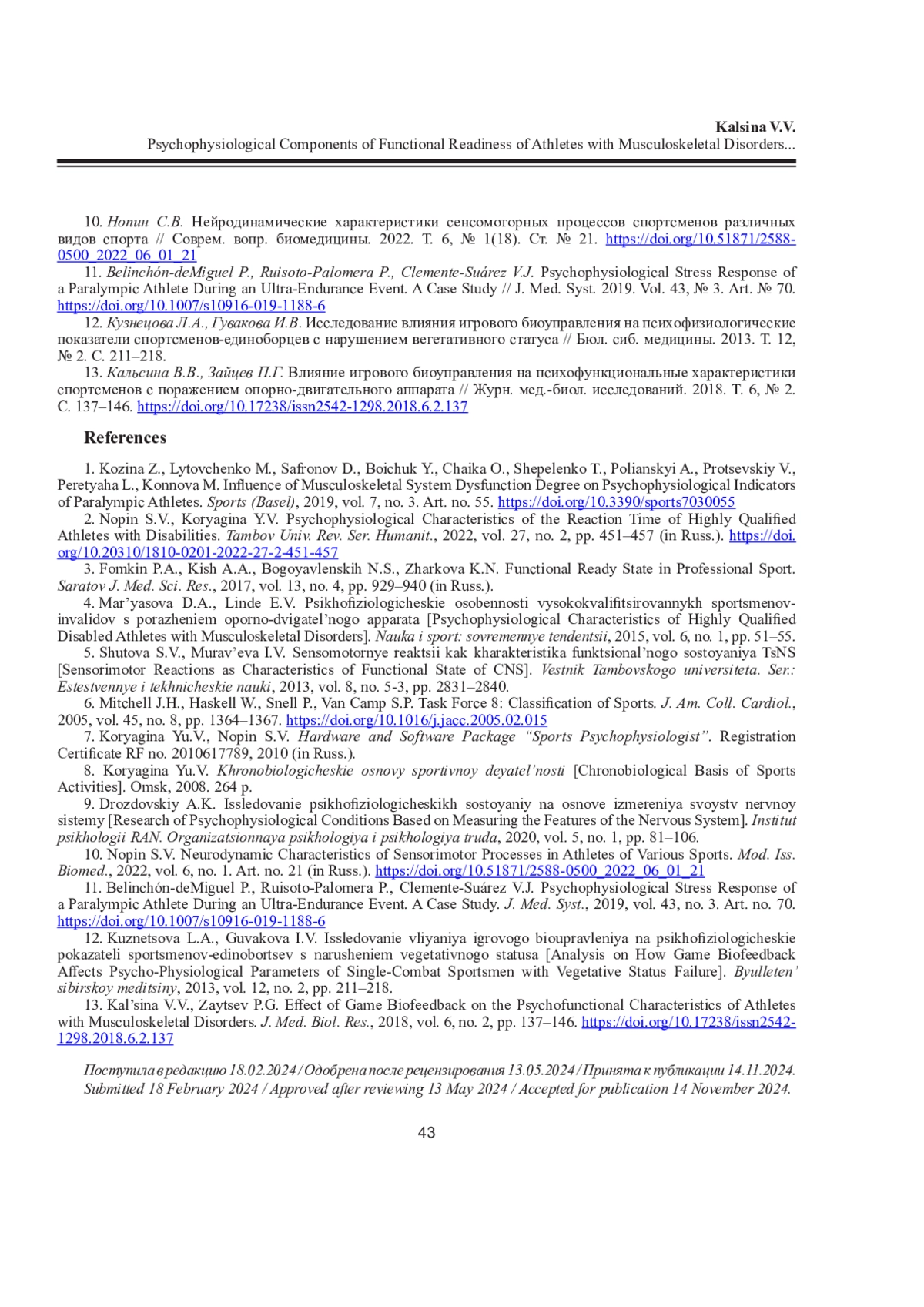 1. Kozina Z., Lytovchenko M., Safronov D., Boichuk Y., Chaika O., Shepelenko T., Polianskyi A., Protsevskiy V., Peretyaha L., Konnova M. Influence of Musculoskeletal System Dysfunction Degree on Psychophysiological Indicators of Paralympic Athletes // Sports (Basel). 2019. Vo l. 7, No 3. Art. No 55. DOI: 10.3390/sports7030055 EDN: QOZHFG