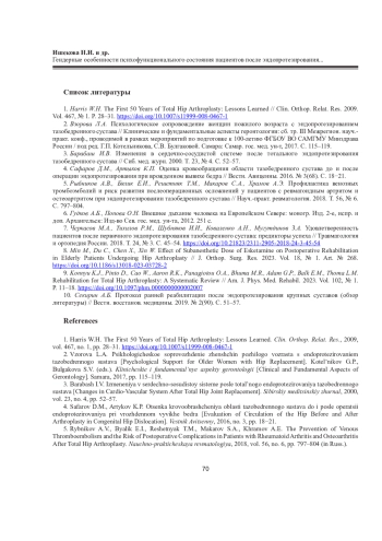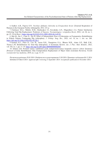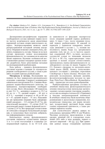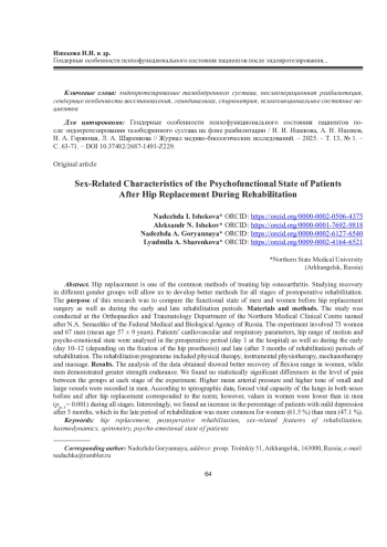 Статья: ГЕНДЕРНЫЕ ОСОБЕННОСТИ ПСИХОФУНКЦИОНАЛЬНОГО СОСТОЯНИЯ ПАЦИЕНТОВ ПОСЛЕ ЭНДОПРОТЕЗИРОВАНИЯ ТАЗОБЕДРЕННОГО СУСТАВА НА ФОНЕ РЕАБИЛИТАЦИИ (2025)