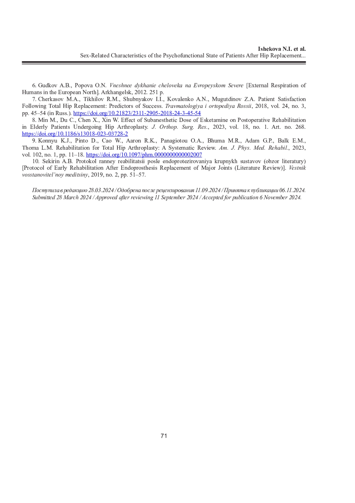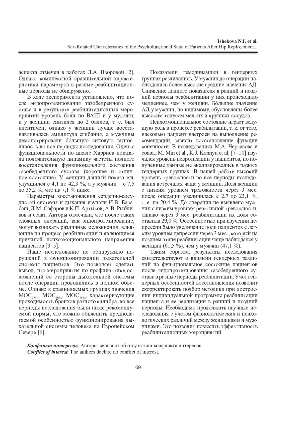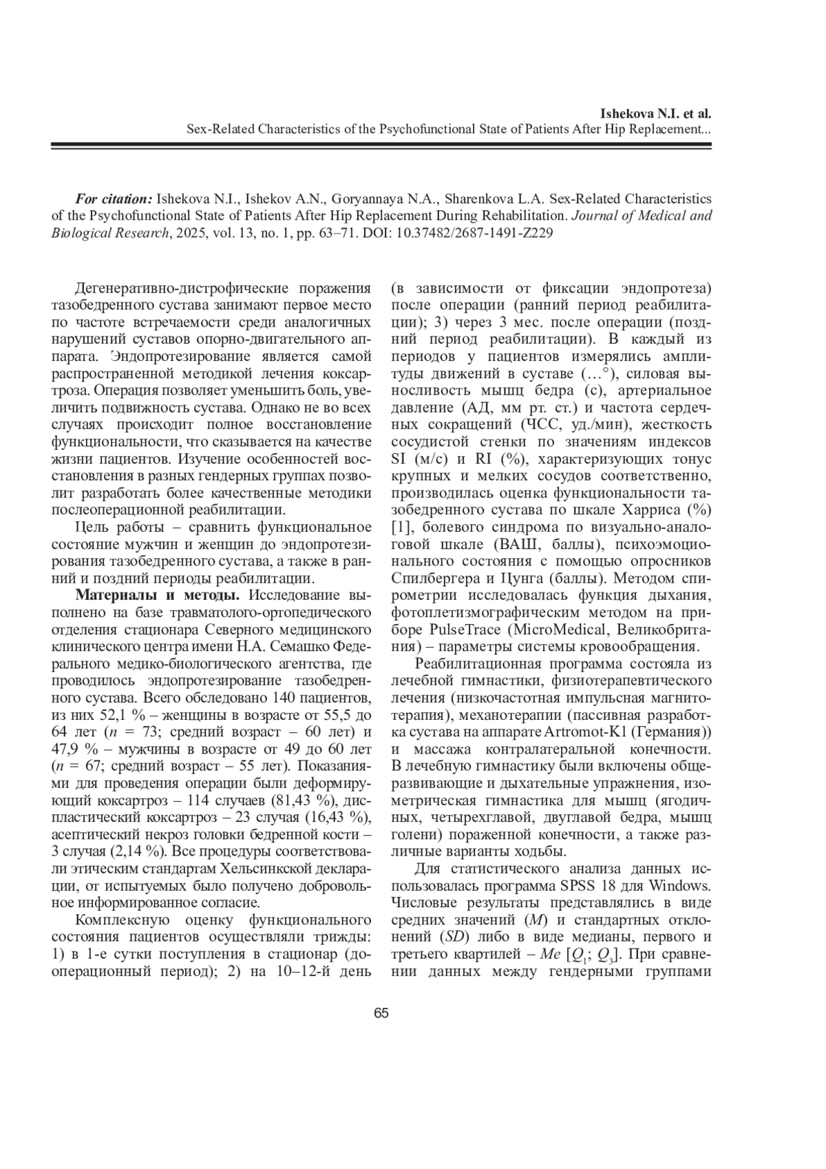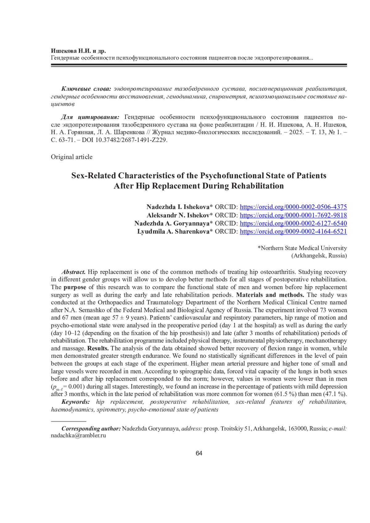 ИШЕКОВА Н. И., ИШЕКОВ А. Н., ГОРЯННАЯ Н. А., ШАРЕНКОВА Л. А. ГЕНДЕРНЫЕ ОСОБЕННОСТИ ПСИХОФУНКЦИОНАЛЬНОГО СОСТОЯНИЯ ПАЦИЕНТОВ ПОСЛЕ ЭНДОПРОТЕЗИРОВАНИЯ ТАЗОБЕДРЕННОГО СУСТАВА НА ФОНЕ РЕАБИЛИТАЦИИ // ЖУРНАЛ МЕДИКО-БИОЛОГИЧЕСКИХ ИССЛЕДОВАНИЙ. 2025. Т. 13 № 1