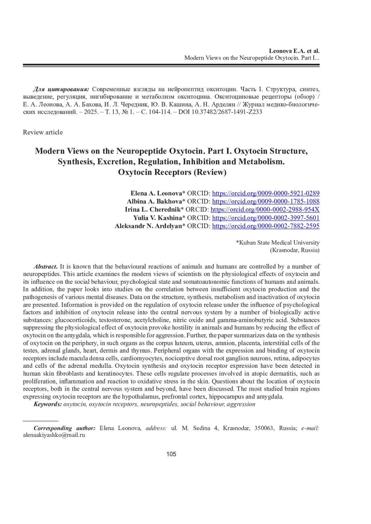 Известно, что поведенческие реакции животных и человека контролируются рядом нейропептидов. В статье рассматриваются современные взгляды научного сообщества на физиологические эффекты окситоцина, его влияние на социальное поведение, психологическое состояние, соматовегетативные функции человека и животных, взаимосвязь недостатка выработки изучаемого гормона с патогенезом ряда психических заболеваний. Представлены данные о строении, синтезе, метаболизме и инактивации окситоцина. Приведены сведения о регуляции выделения окситоцина под влиянием психологических факторов и ингибирования выхода окситоцина в ЦНС рядом биологически активных веществ: глюкокортикоиды, тестостерон, ацетилхолин, оксид азота, гамма-аминомасляная кислота. Вещества, подавляющее физиологическое действие окситоцина за счет снижения его влияния на миндалевидное тело, отвечающее за агрессивность, провоцируют враждебность у животных и людей. Обобщены данные о синтезе окситоцина на периферии, в таких органах, как желтое тело, матка, амнион, плацента, интерстициальные клетки семенников, надпочечники, сердце, дерма и тимус. К периферическим органам с экспрессией и связыванием окситоциновых рецепторов относятся клетки плотного пятна коры почек, кардиомиоциты, ноцицептивные ганглиозные нейроны дорсальных корешков, сетчатка, адипоциты и клетки мозгового вещества надпочечников. Синтез окситоцина и экспрессия рецепторов к нему были обнаружены в фибробластах и кератиноцитах кожи человека. Эти клеточные элементы регулируют процессы, участвующие в атопическом дерматите, такие как пролиферация, воспаление и реакция на окислительный стресс в коже. Обсуждены вопросы о расположении рецепторов окситоцина как в ЦНС, так и за ее пределами. Среди областей мозга, которые экспрессируют окситоциновые рецепторы, наиболее изученными являются гипоталамус, префронтальная кора, гиппокамп и миндалевидное тело.