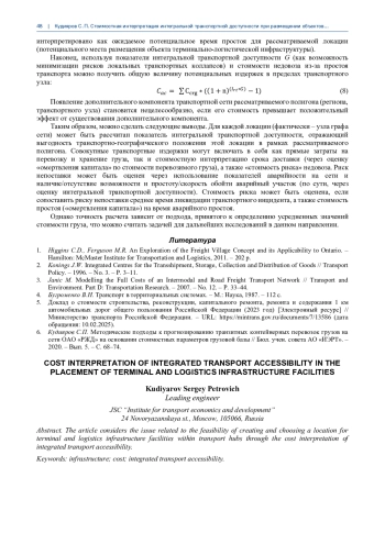 В статье рассматривается вопрос оценки целесообразности создания и выбора места размещения объектов терминально-логистической инфраструктуры в пределах транспортных узлов через стоимостную интерпретацию интегральной транспортной доступности.