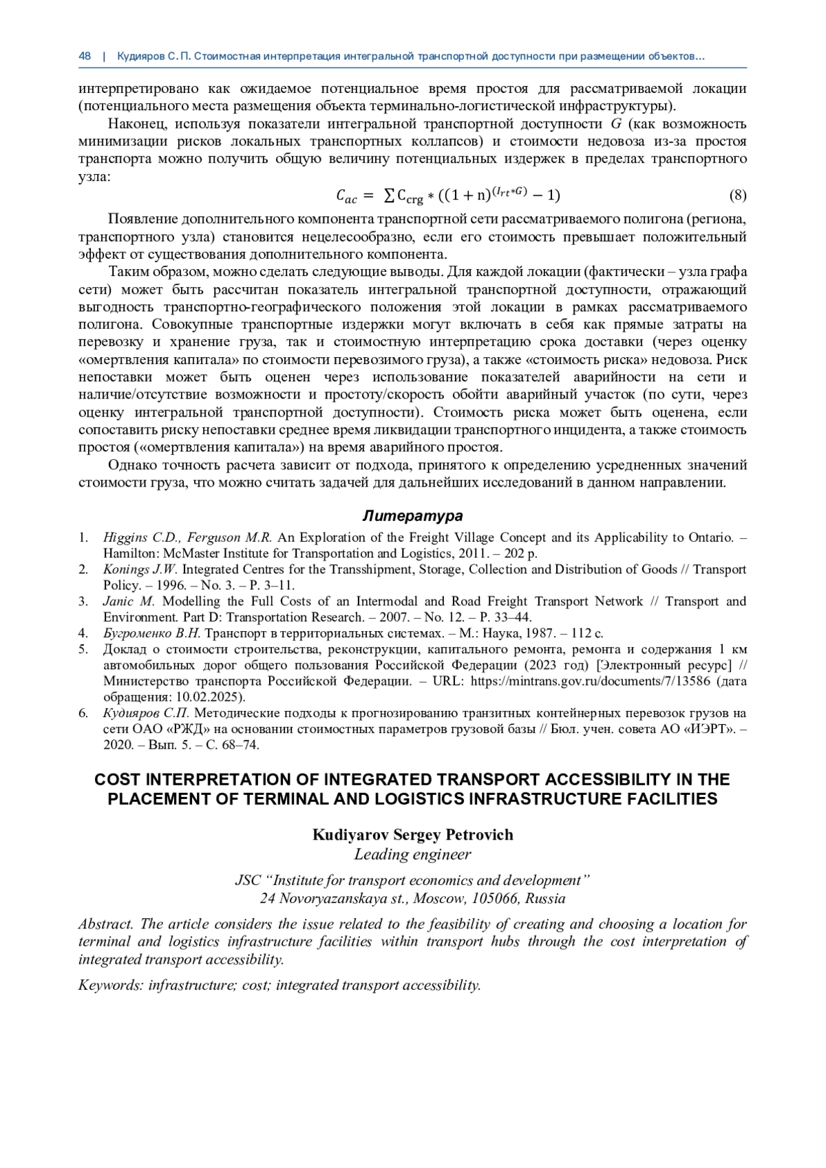 6. Кудияров С.П. Методические подходы к прогнозированию транзитных контейнерных перевозок грузов на сети ОАО “РЖД” на основании стоимостных параметров грузовой базы // Бюл. учен. совета АО “ИЭРТ”. - 2020. - Вып. 5. - С. 68-74.