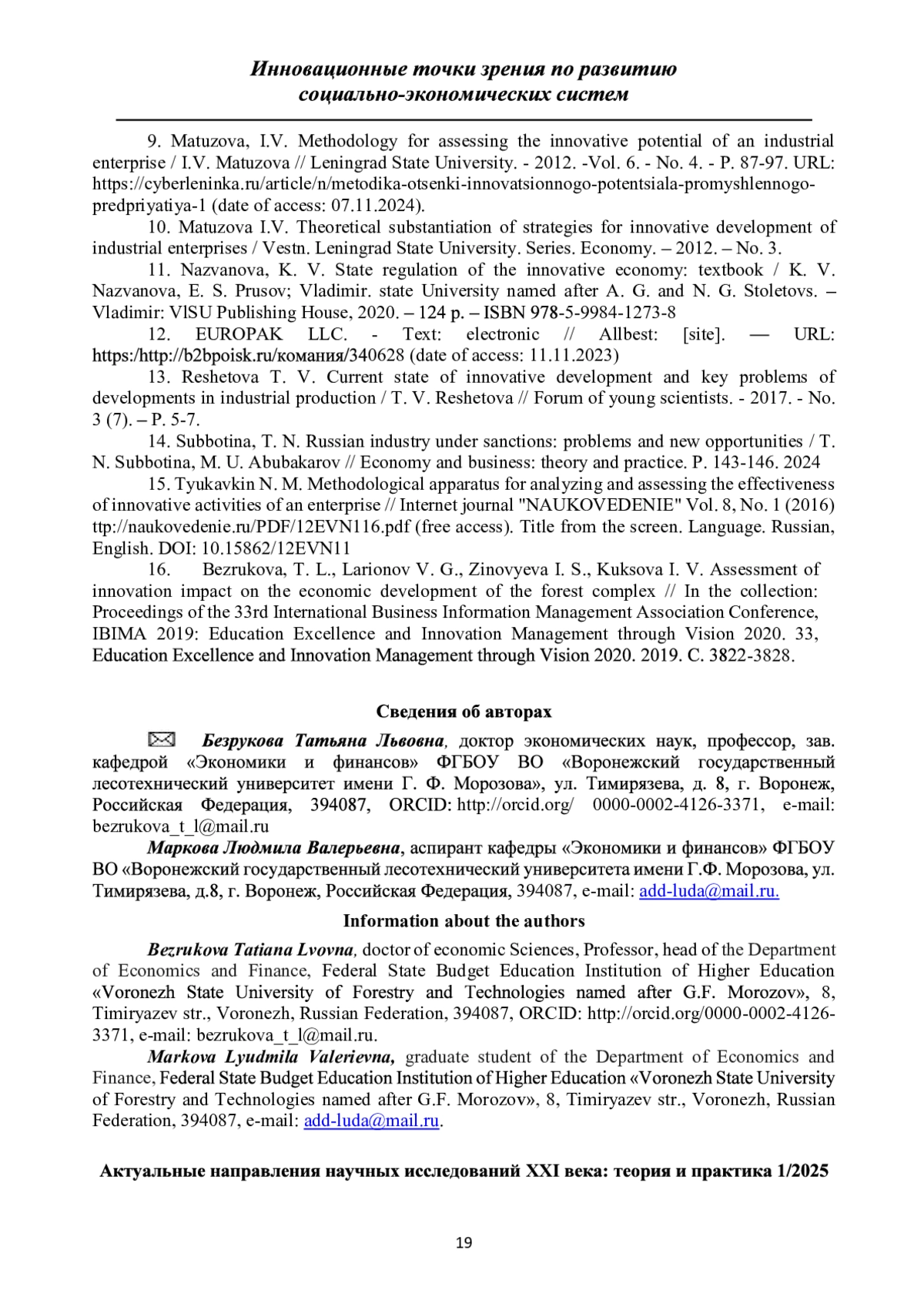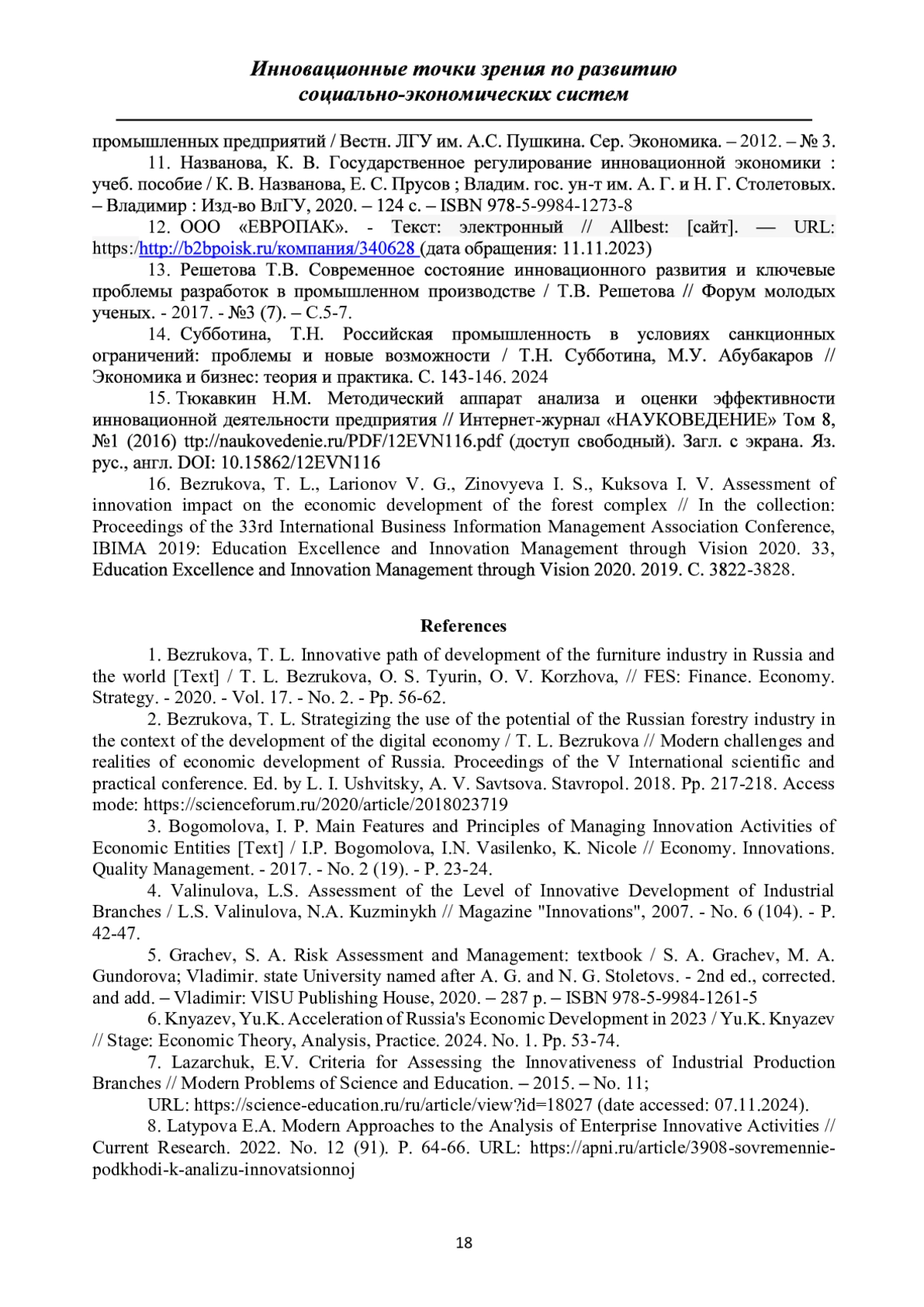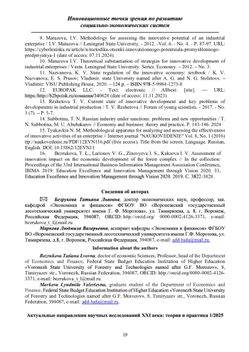 16. Bezrukova, T. L., Larionov V. G., Zinovyeva I. S., Kuksova I. V. Assessment of innovation impact on the economic development of the forest complex // In the collection: Proceedings of the 33rd International Business Information Management Association Conference, IBIMA 2019: Education Excellence and Innovation Management through Vision 2020. 33, Education Excellence and Innovation Management through Vision 2020. 2019. С. 3822-3828. EDN: DVNOQX