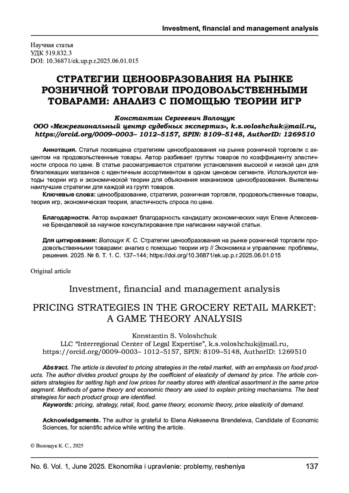 Статья посвящена стратегиям ценообразования на рынке розничной торговли с акцентом на продовольственные товары. Автор разбивает группы товаров по коэффициенту эластичности спроса по цене. В статье рассматриваются стратегии установления высокой и низкой цен для близлежащих магазинов с идентичным ассортиментом в одном ценовом сегменте. Используются методы теории игр и экономической теории для объяснения механизмов ценообразования. Выявлены наилучшие стратегии для каждой из групп товаров.