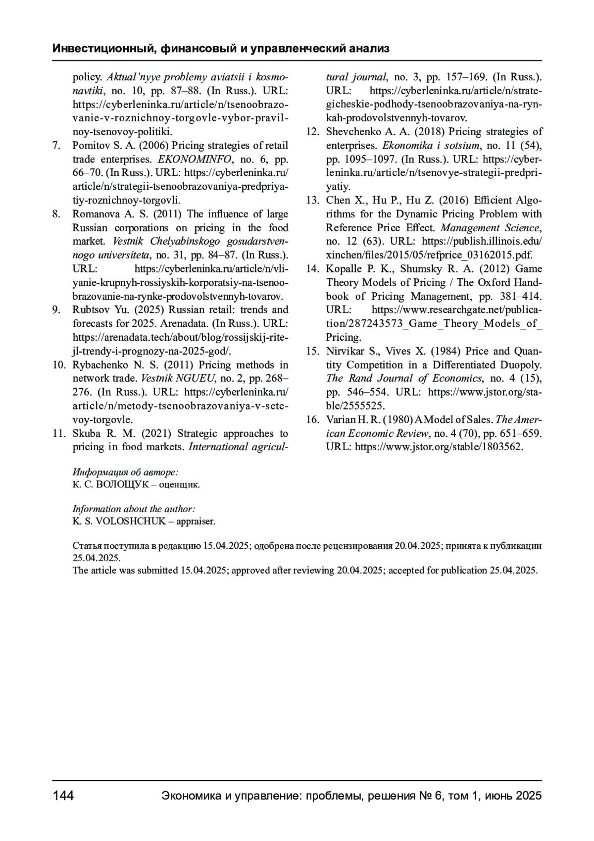 11. Скуба Р. М. Стратегические подходы ценообразования на рынках продовольственных товаров // International agricultural journal. 2021. № 3. С. 157-169. URL: https://cyberleninka.ru/article/n/strategicheskie-podhody-tsenoobrazovaniya-na-rynkah-prodovolstvennyh-tovarov.