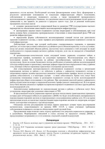1. Бородин А.Ф. Емкость железных дорог и управление вагонными парками // РЖД-Партнер. - 2011. - № 5. - С. 32-34.