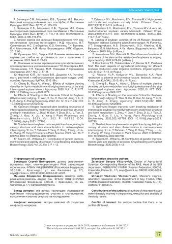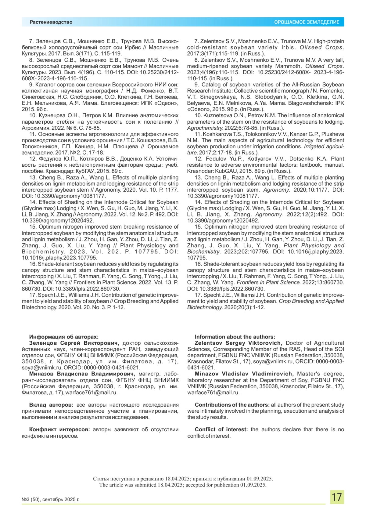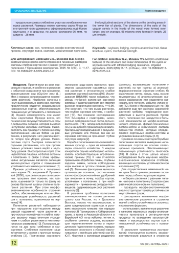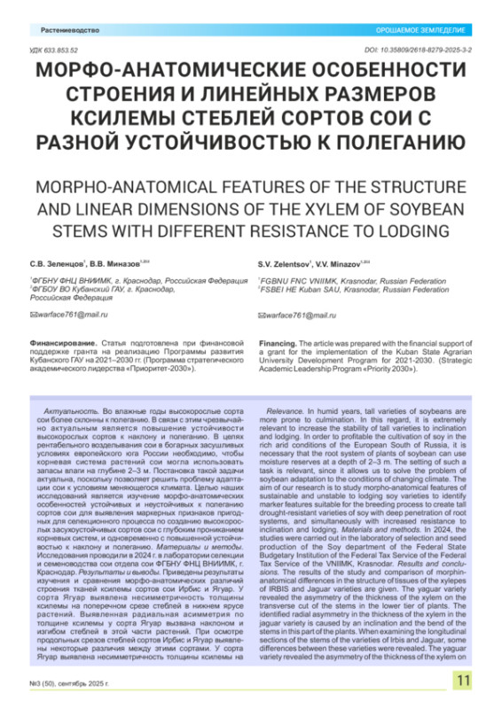 ЗЕЛЕНЦОВ С. В., МИНАЗОВ В. В. МОРФО-АНАТОМИЧЕСКИЕ ОСОБЕННОСТИ СТРОЕНИЯ И ЛИНЕЙНЫХ РАЗМЕРОВ КСИЛЕМЫ СТЕБЛЕЙ СОРТОВ СОИ С РАЗНОЙ УСТОЙЧИВОСТЬЮ К ПОЛЕГАНИЮ // ОРОШАЕМОЕ ЗЕМЛЕДЕЛИЕ. 2025. № 3 (50)