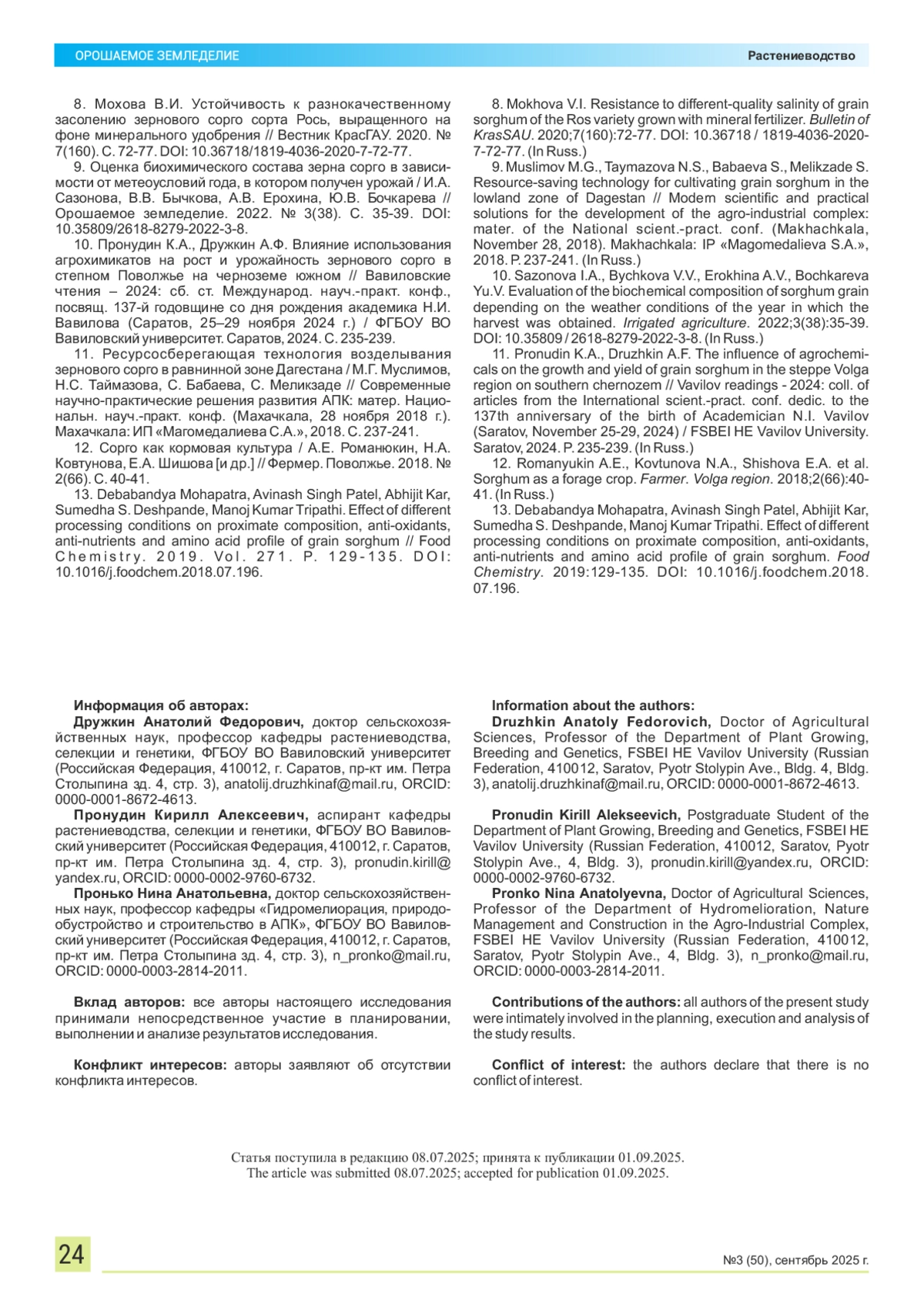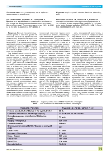 Применение современных агрохимикатов (пестициды, гербициды, удобрения и другие агрохимические препараты), направленное на получение высоких урожаев сельскохозяйственных культур и защиту культур, в настоящее время является чрезвычайно важным вопросом в агрономии. В задачи исследований входила оценка влияния различных агрохимикатов на рост и развитие зернового сорго, урожайность и качество зерна зернового сорго. Материалы и методы. Исследования проводились в Гагаринском районе Саратовской области на черноземе южном в 2021-2023 гг. Почва представлена черноземом южным маломощным, среднесуглинистым, типичным для сухих черноземных степей Юго-Востока России. Результаты и выводы. Было установлено положительное влияние ростостимулирующих препаратов и удобрений на морфометрические показатели зернового сорго по сравнению с контрольным вариантом. Обработка агрохимикатами способствовала ускорению ростовых процессов и увеличению вегетационной массы. Максимальные показатели увеличения урожайности биомассы и зерна были выявлены на вариантах с внесением ростостимулирующих препаратов. Установлено, что раздельное и совместное применение минеральных удобрений, ростовых препаратов и гербицида Аминопелик существенно повлияли на продуктивность зернового сорго. В среднем в 2021-2023 гг. высокая урожайность зерна была достигнута благодаря применению комплекса агрохимических препаратов в период вегетации растений. Разовое применение агрохимикатов способствовало увеличение урожайности зерна сорго на 7-10 %, комплексное применение увеличило урожайность зерна на 16-18 % по сравнению с контрольным вариантом. В целом, результаты исследований подчеркивают важность применения комплексных агрохимических препаратов для повышения урожайности зернового сорго в условиях Саратовской области на черноземе южном.