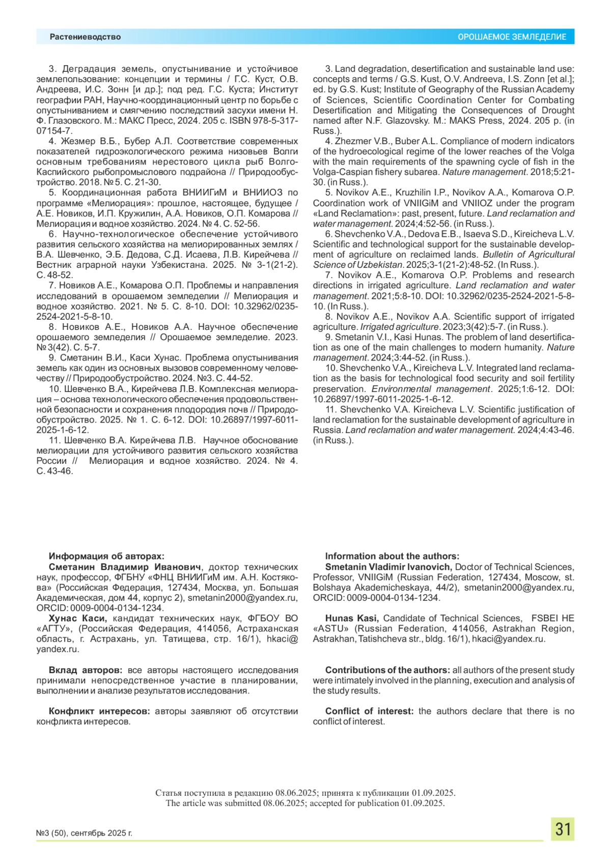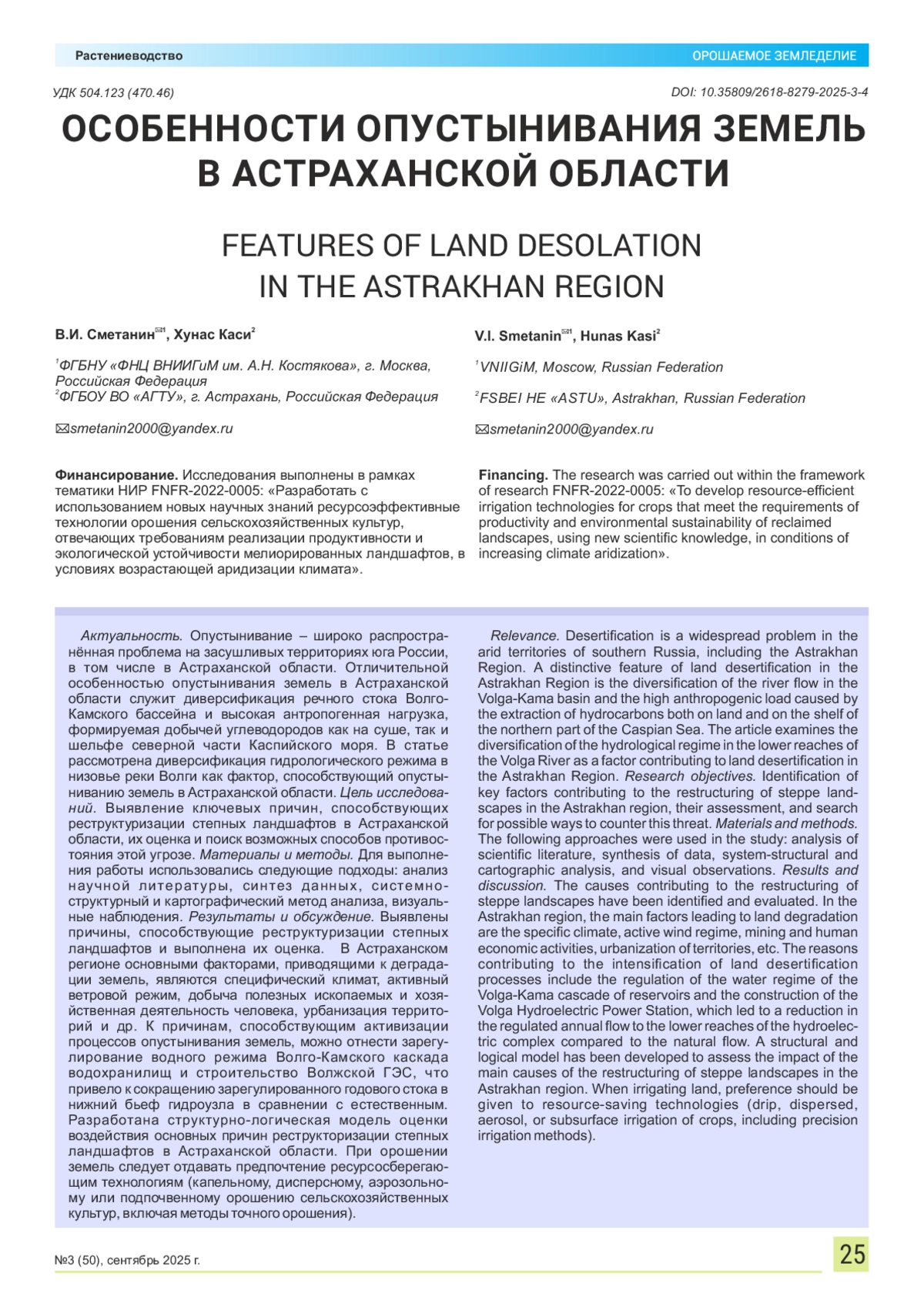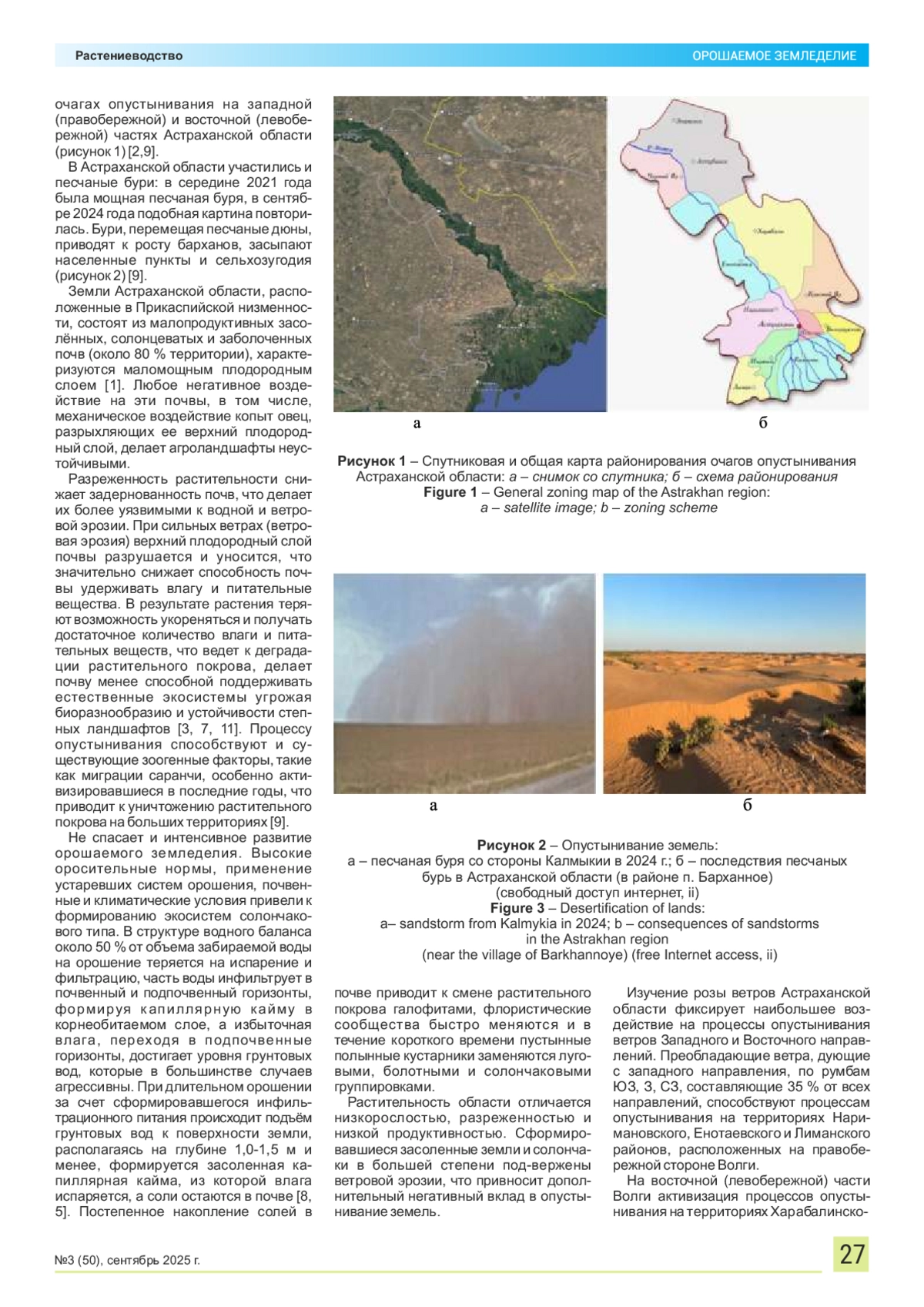 СМЕТАНИН В. И., ХУНАС К. ОСОБЕННОСТИ ОПУСТЫНИВАНИЯ ЗЕМЕЛЬ В АСТРАХАНСКОЙ ОБЛАСТИ // ОРОШАЕМОЕ ЗЕМЛЕДЕЛИЕ. 2025. № 3 (50)