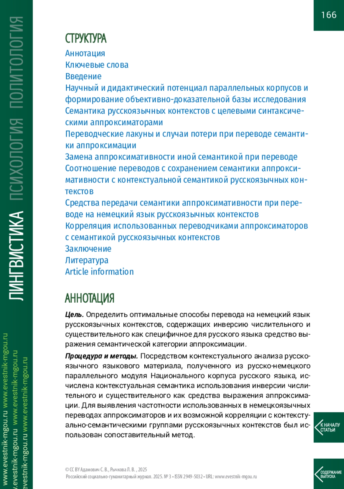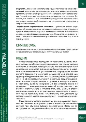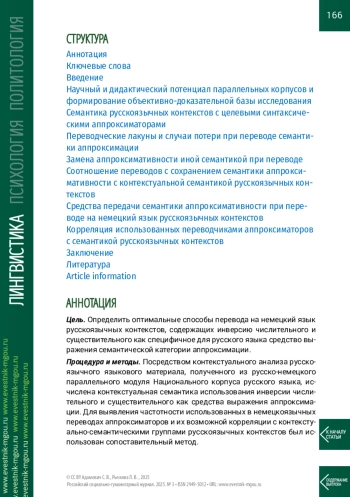 Статья: ПЕРЕВОД НА НЕМЕЦКИЙ ЯЗЫК КОНТЕКСТОВ СО СПЕЦИФИЧНЫМИ ДЛЯ РУССКОГО ЯЗЫКА СИНТАКСИЧЕСКИМИ АППРОКСИМАТОРАМИ (2025)