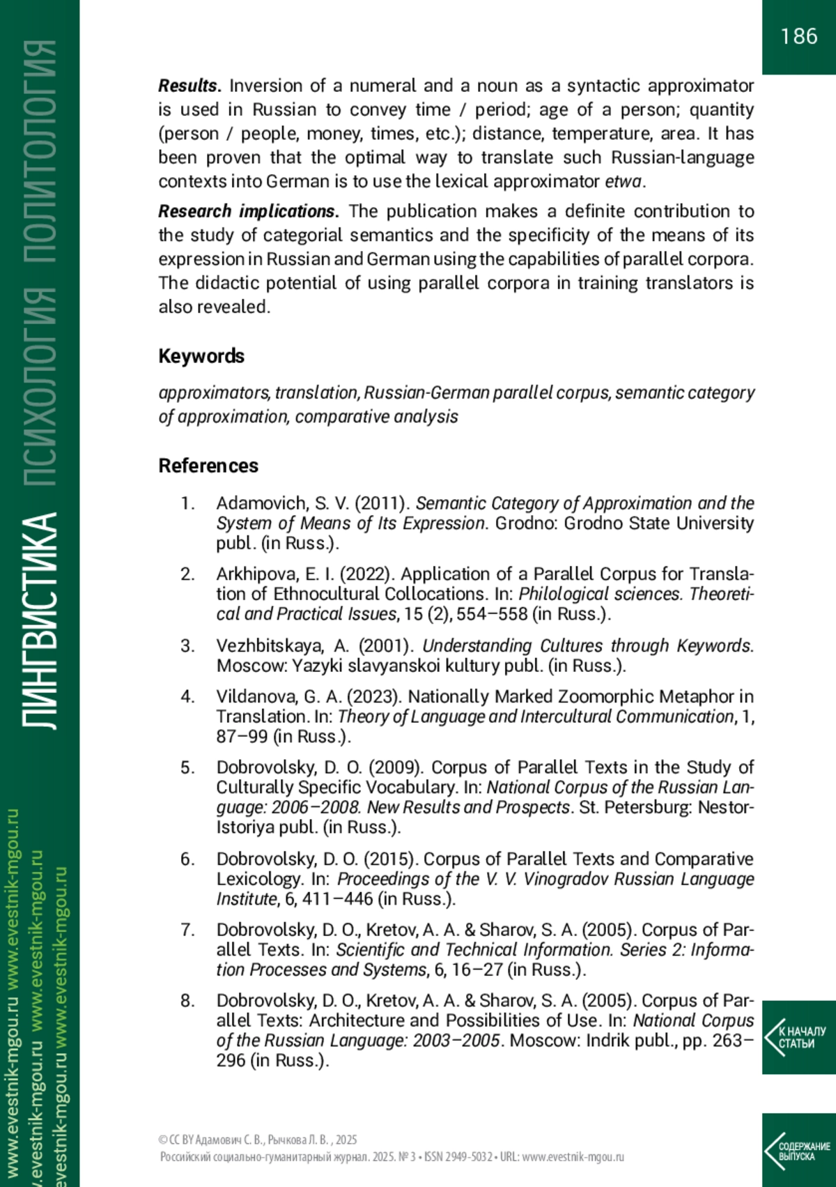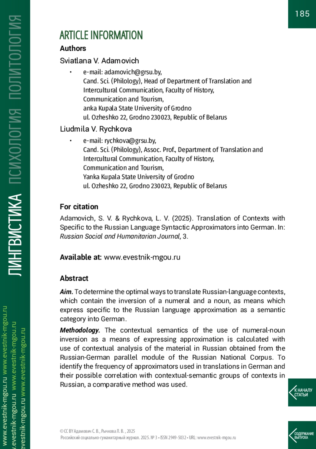 АДАМОВИЧ С. В., РЫЧКОВА Л. В. ПЕРЕВОД НА НЕМЕЦКИЙ ЯЗЫК КОНТЕКСТОВ СО СПЕЦИФИЧНЫМИ ДЛЯ РУССКОГО ЯЗЫКА СИНТАКСИЧЕСКИМИ АППРОКСИМАТОРАМИ // РОССИЙСКИЙ СОЦИАЛЬНО-ГУМАНИТАРНЫЙ ЖУРНАЛ. 2025. №3