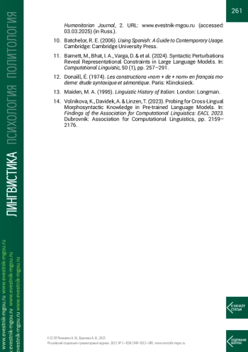 11. Barnett M., Bhat I. A., Varga D., et al. Syntactic Perturbations Reveal Representational Constraints in Large Language Models // Computational Linguistic. 2024. T. 50. No. 1. P. 257-291.