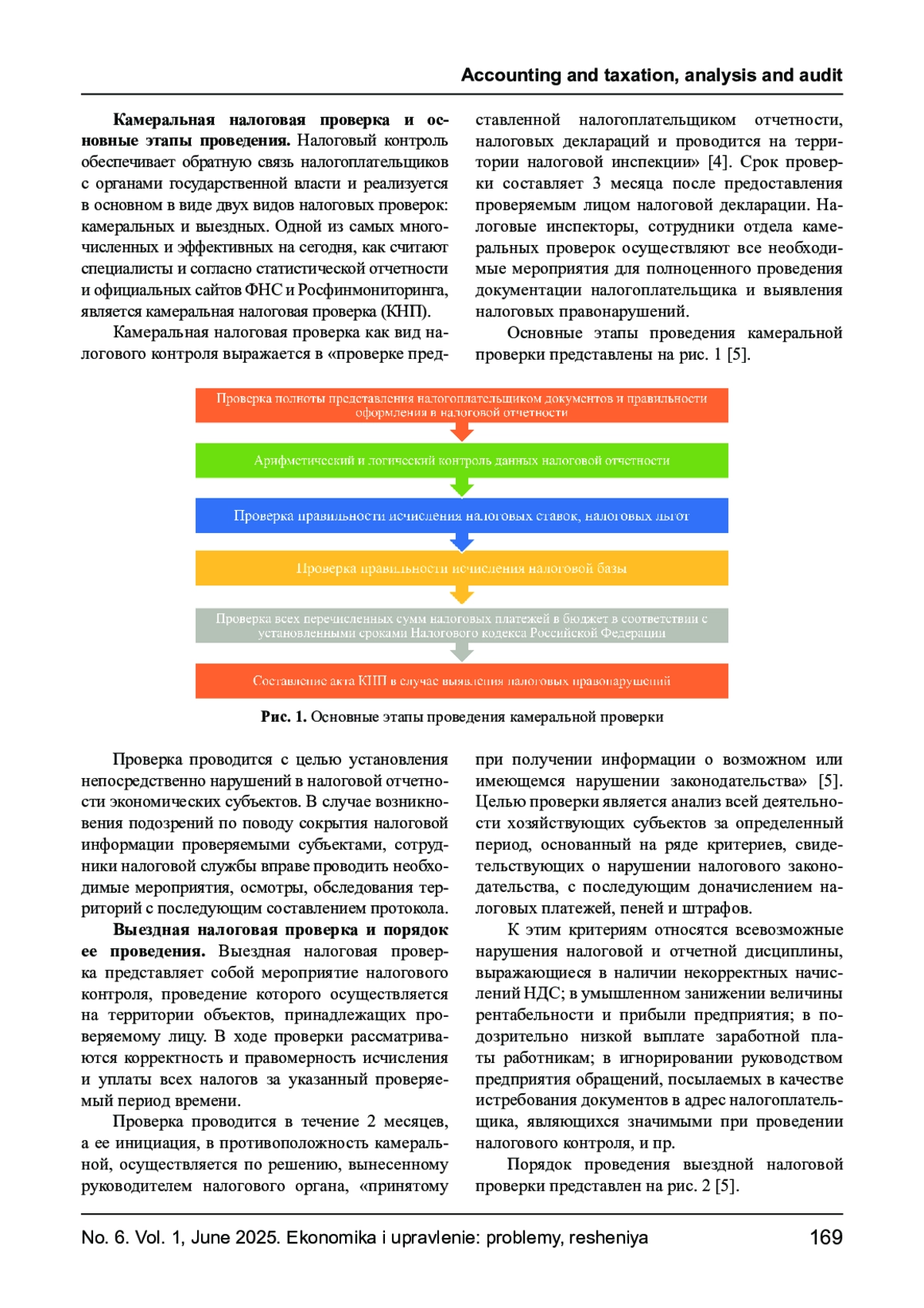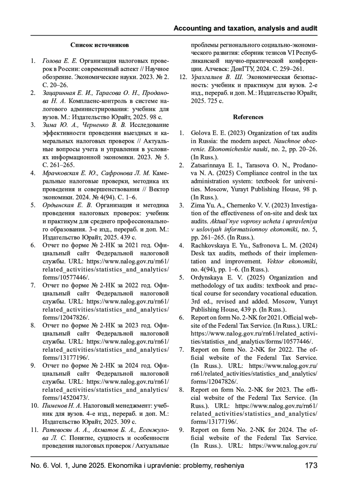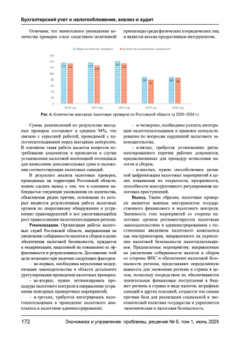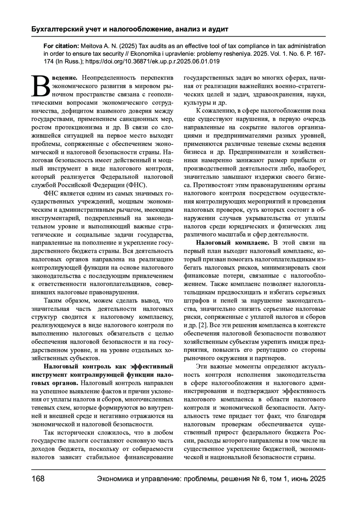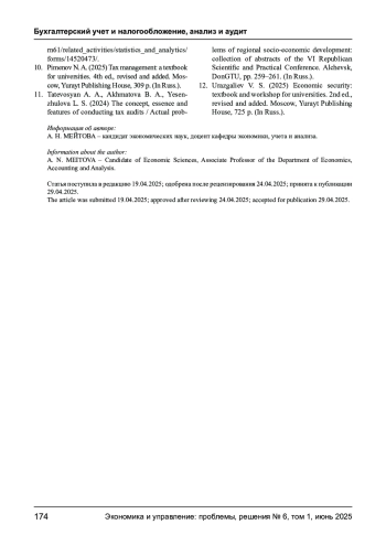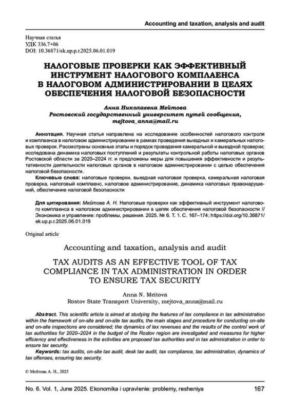 МЕЙТОВА А. Н. НАЛОГОВЫЕ ПРОВЕРКИ КАК ЭФФЕКТИВНЫЙ ИНСТРУМЕНТ НАЛОГОВОГО КОМПЛАЕНСА В НАЛОГОВОМ АДМИНИСТРИРОВАНИИ В ЦЕЛЯХ ОБЕСПЕЧЕНИЯ НАЛОГОВОЙ БЕЗОПАСНОСТИ // ЭКОНОМИКА И УПРАВЛЕНИЕ: ПРОБЛЕМЫ, РЕШЕНИЯ. 2025. ТОМ 1 № 6