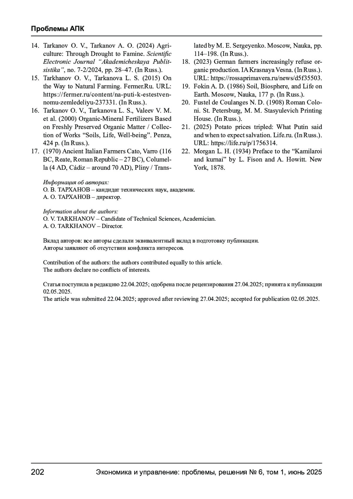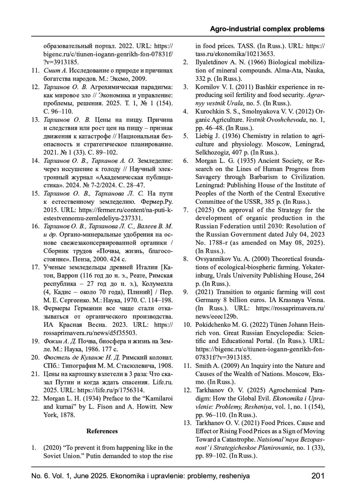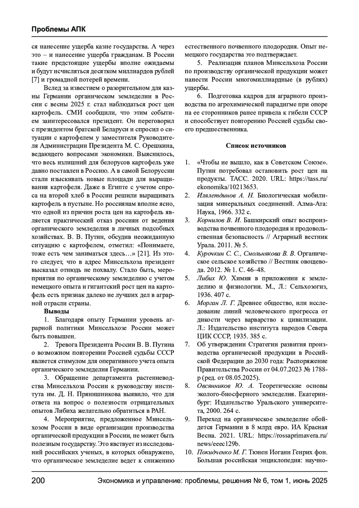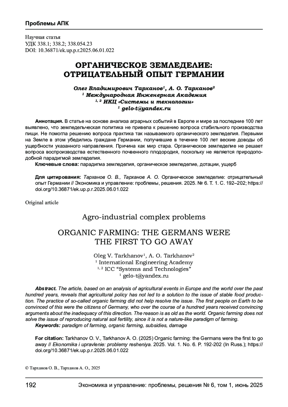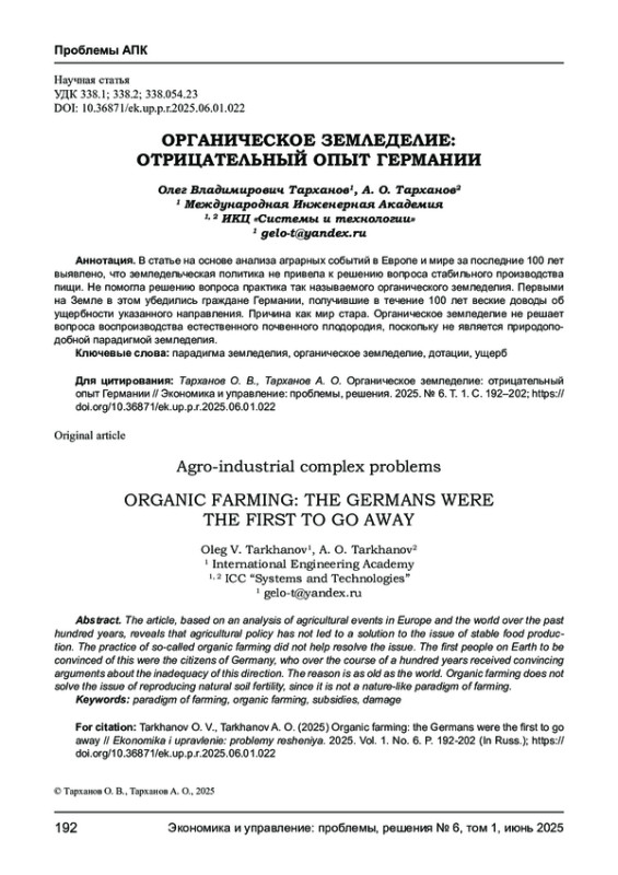 ТАРХАНОВ О. В., ТАРХАНОВ А. О. ОРГАНИЧЕСКОЕ ЗЕМЛЕДЕЛИЕ: ОТРИЦАТЕЛЬНЫЙ ОПЫТ ГЕРМАНИИ // ЭКОНОМИКА И УПРАВЛЕНИЕ: ПРОБЛЕМЫ, РЕШЕНИЯ. 2025. ТОМ 1 № 6