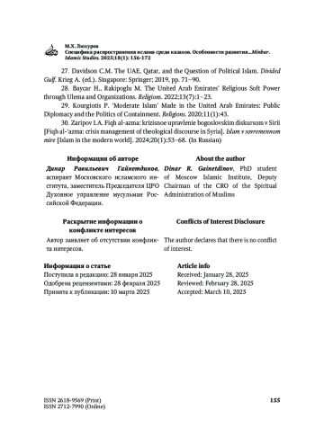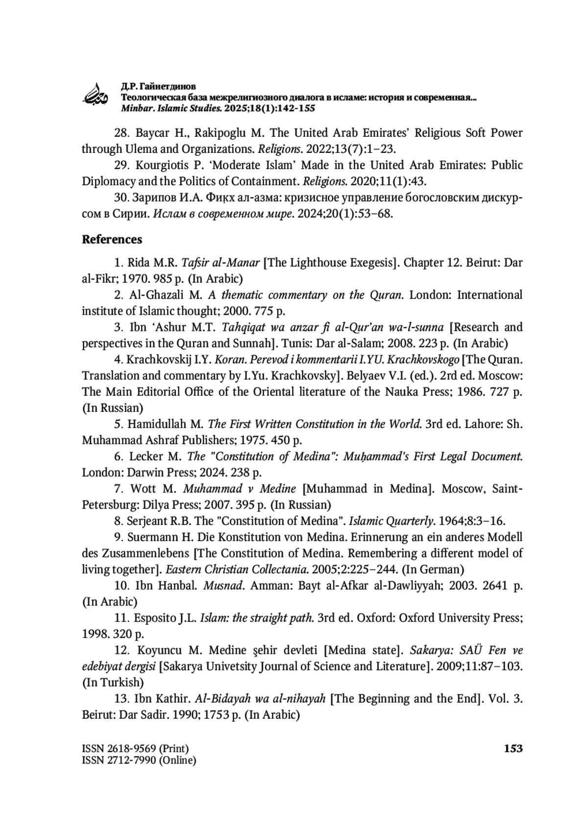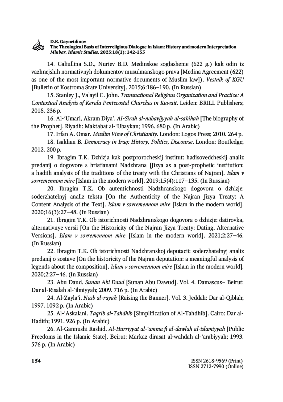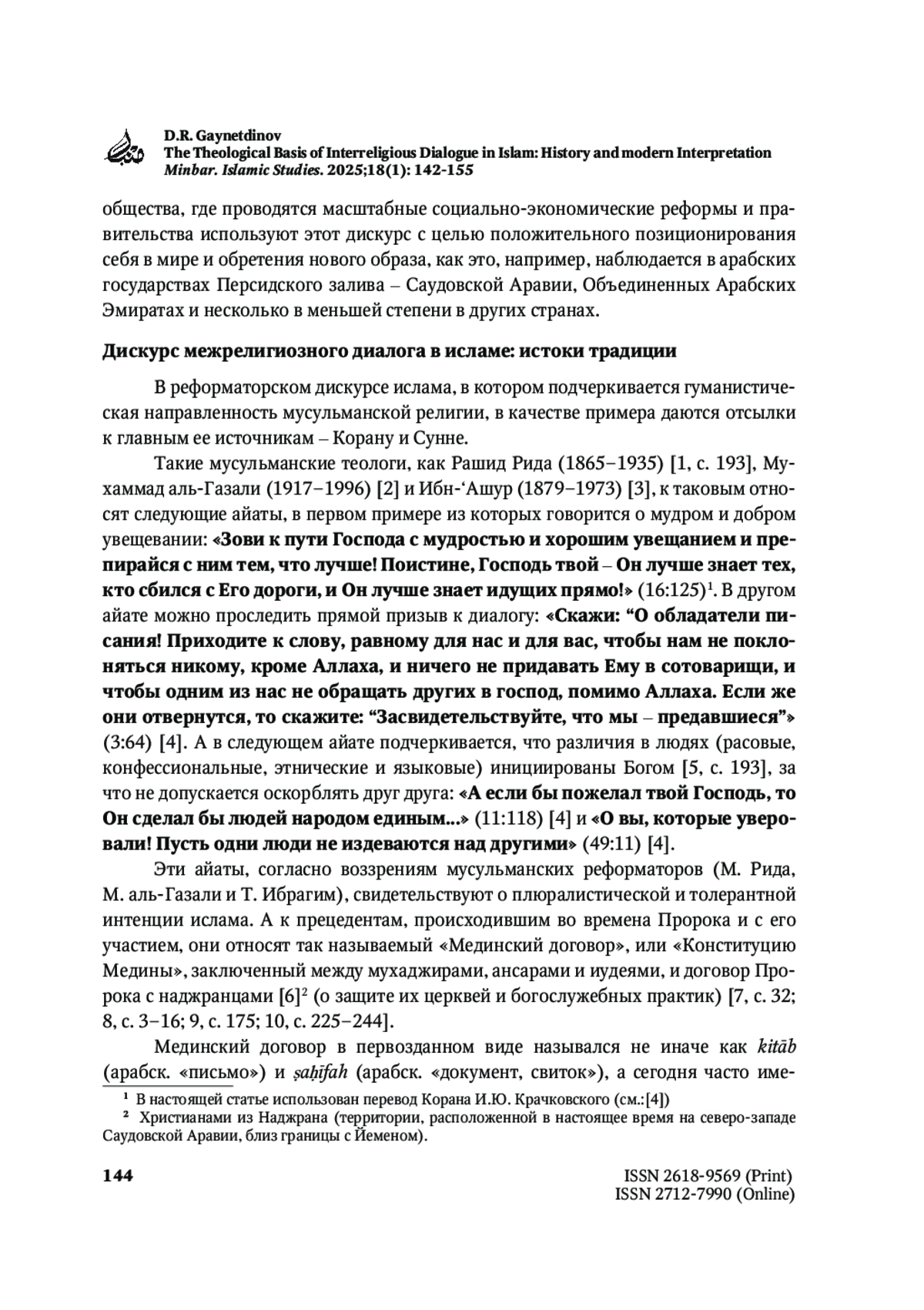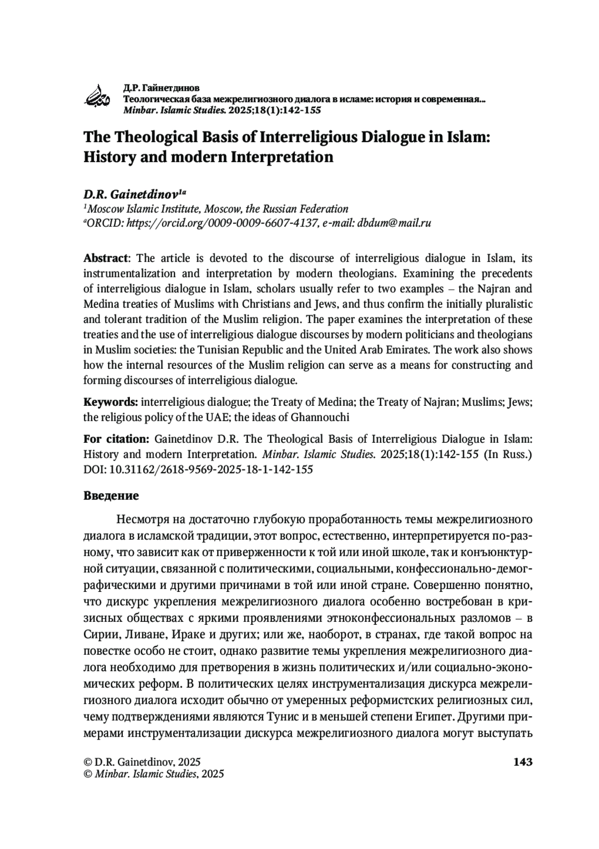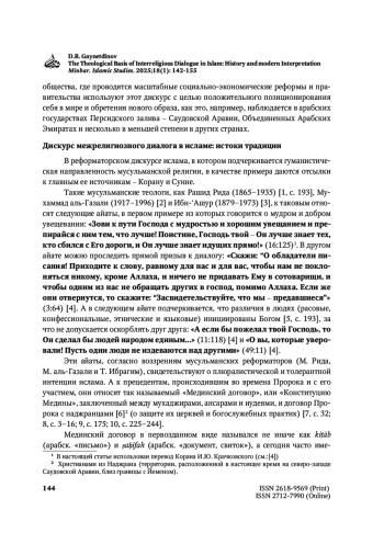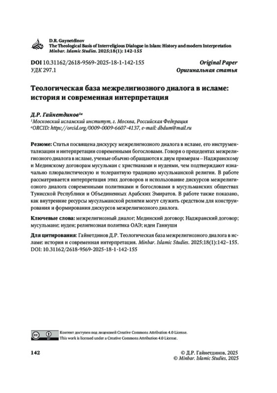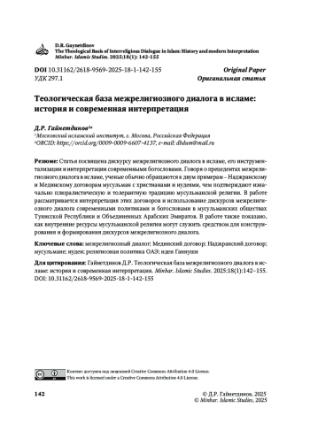 ГАЙНЕТДИНОВ Д. Р. ТЕОЛОГИЧЕСКАЯ БАЗА МЕЖРЕЛИГИОЗНОГО ДИАЛОГА В ИСЛАМЕ: ИСТОРИЯ И СОВРЕМЕННАЯ ИНТЕРПРЕТАЦИЯ // MINBAR. ISLAMIC STUDIES. 2025. № 1, ТОМ 18
