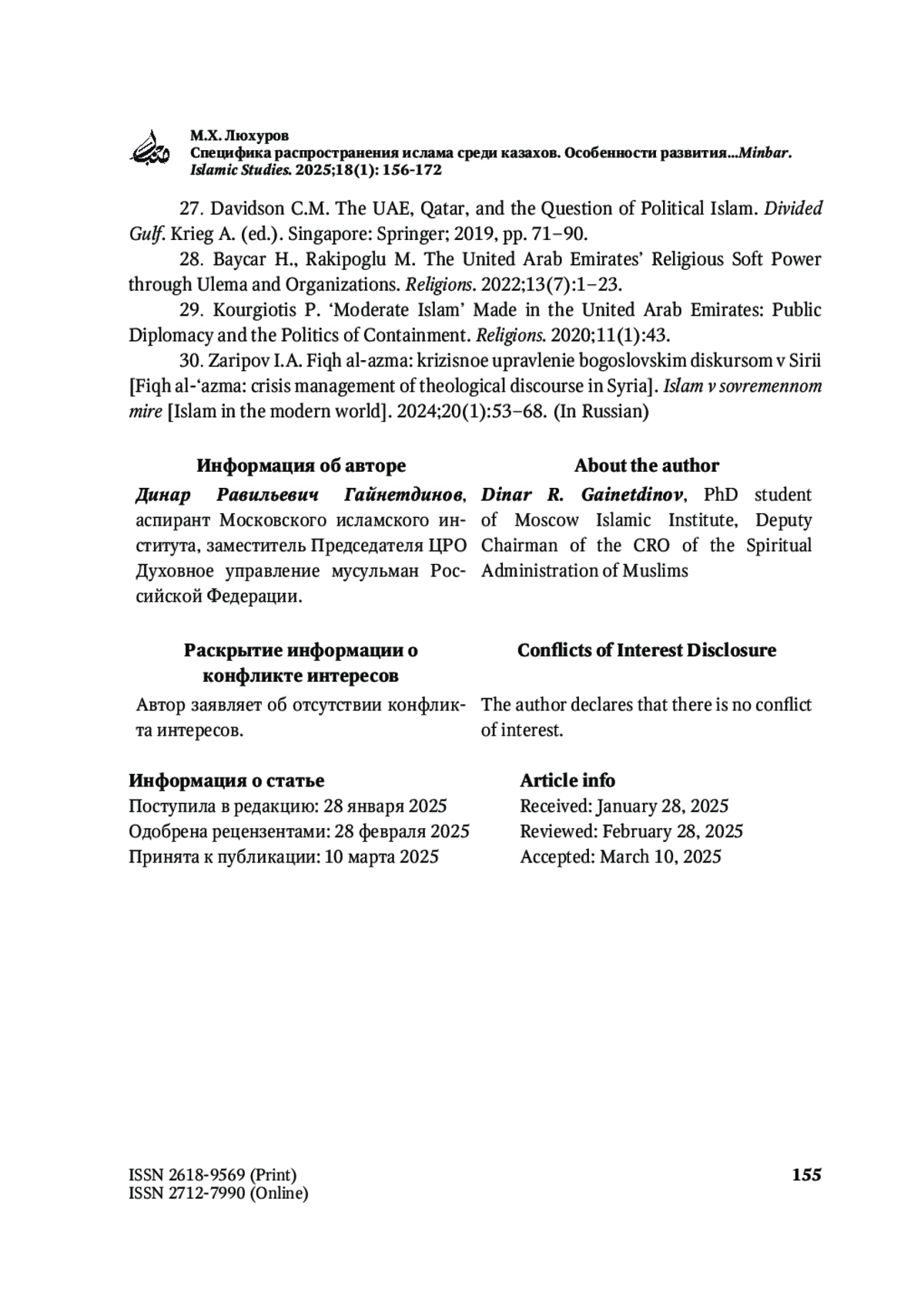 Журнал: MINBAR. ISLAMIC STUDIES