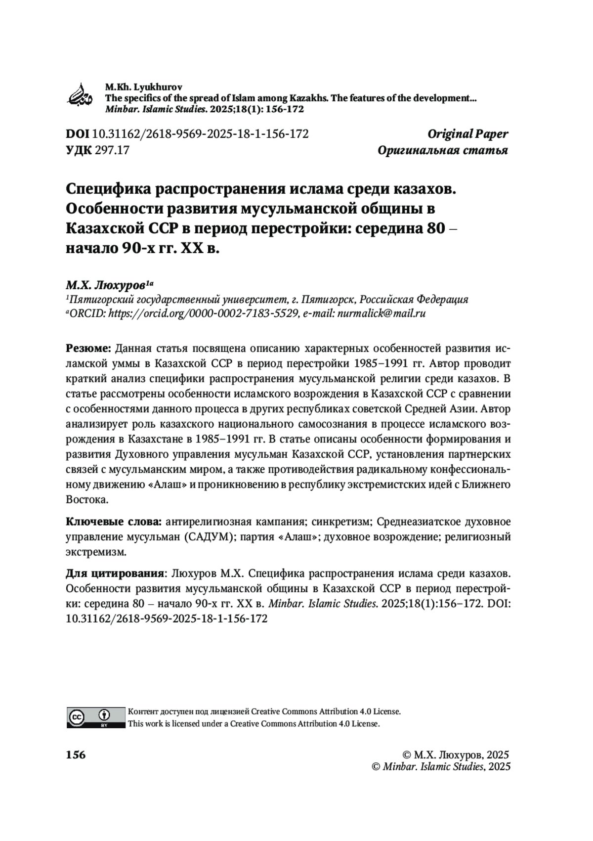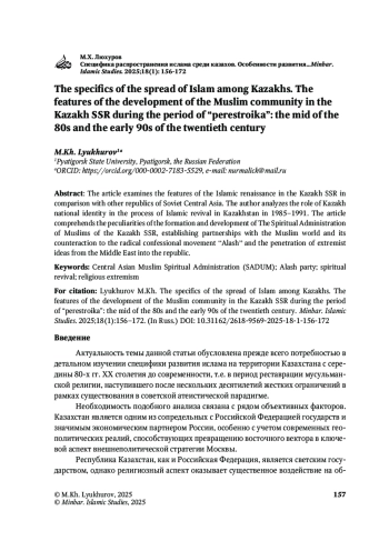 Данная статья посвящена описанию характерных особенностей развития исламской уммы в Казахской ССР в период перестройки 1985–1991 гг. Автор проводит краткий анализ специфики распространения мусульманской религии среди казахов. В статье рассмотрены особенности исламского возрождения в Казахской ССР с сравнении с особенностями данного процесса в других республиках советской Средней Азии. Автор анализирует роль казахского национального самосознания в процессе исламского возрождения в Казахстане в 1985–1991 гг. В статье описаны особенности формирования и развития Духовного управления мусульман Казахской ССР, установления партнерских связей с мусульманским миром, а также противодействия радикальному конфессиональному движению «Алаш» и проникновению в республику экстремистских идей с Ближнего Востока.