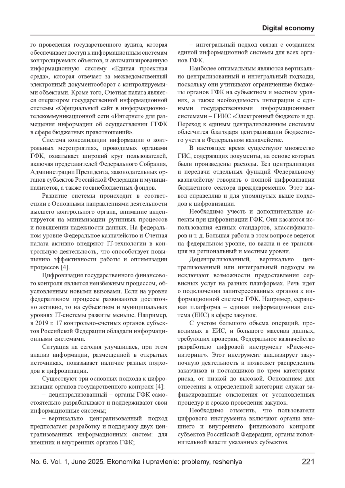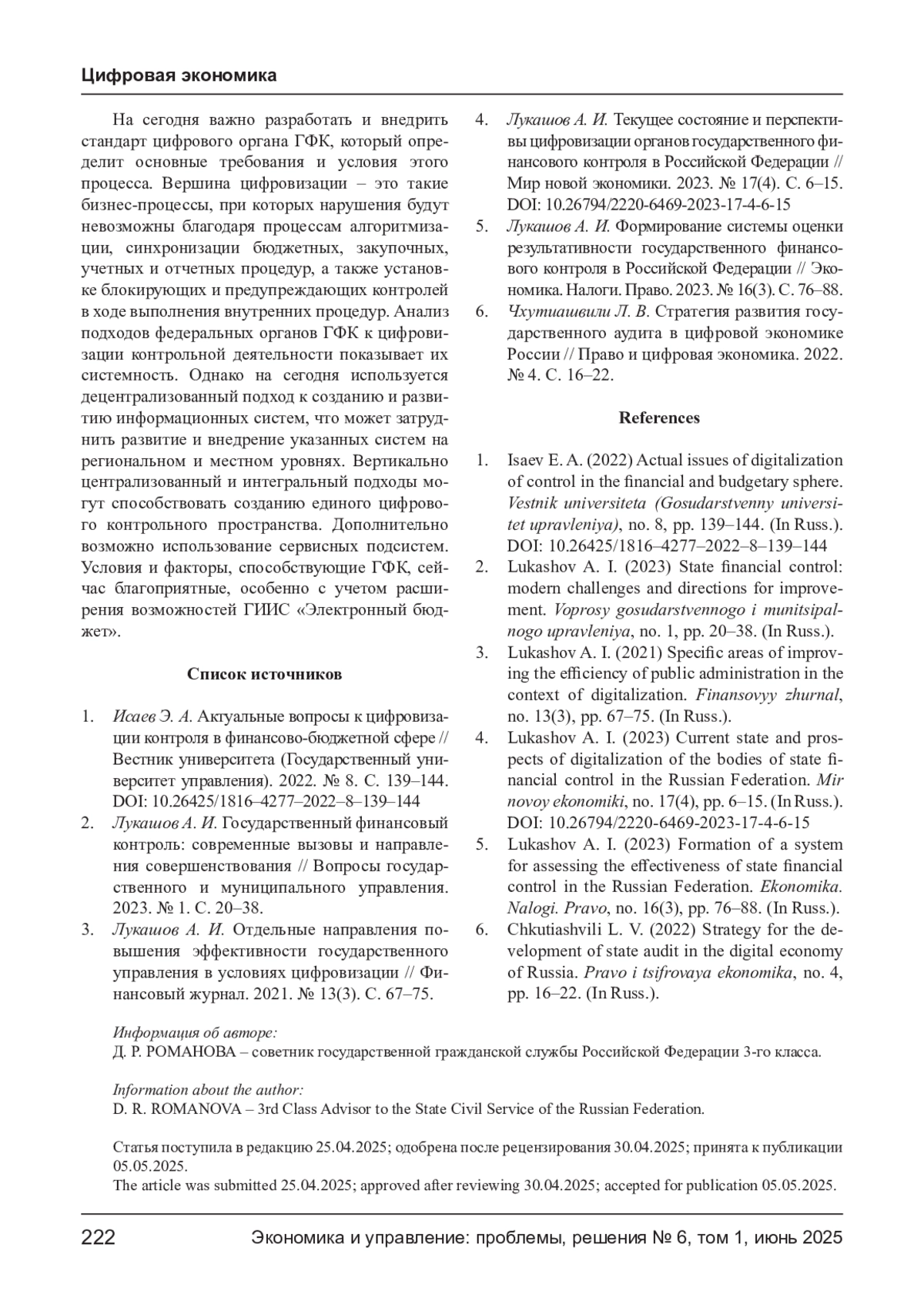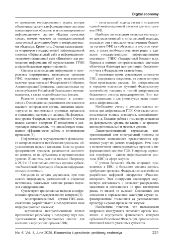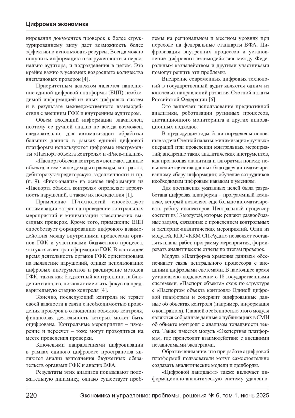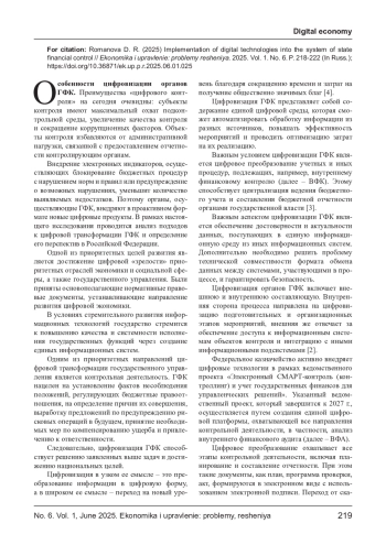 РОМАНОВА Д. Р. ВНЕДРЕНИЕ ЦИФРОВЫХ ТЕХНОЛОГИЙ В СИСТЕМУ ГОСУДАРСТВЕННОГО ФИНАНСОВОГО КОНТРОЛЯ // ЭКОНОМИКА И УПРАВЛЕНИЕ: ПРОБЛЕМЫ, РЕШЕНИЯ. 2025. ТОМ 1 № 6