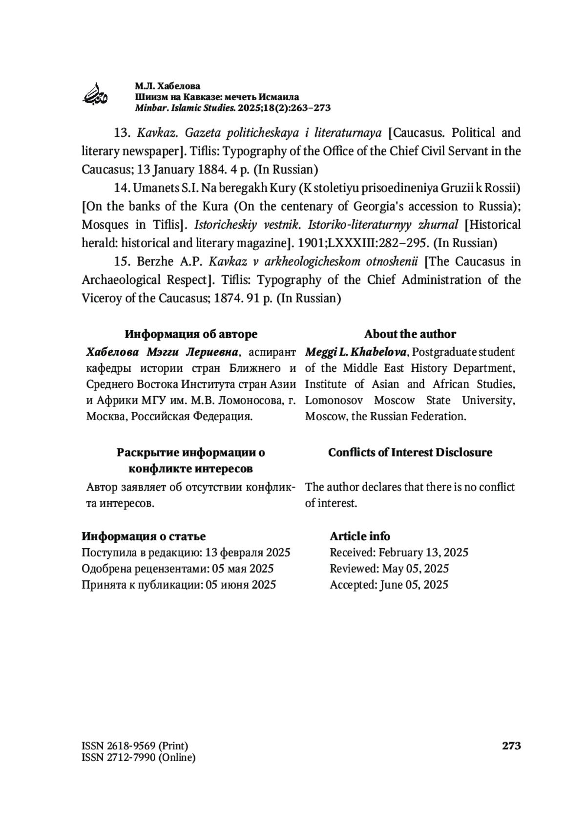 10. Гюльденштедт И.А. Путешествие по Кавказу в 1770-1773 гг. Шафрановская Т.К. (пер.). Санкт-Петербург: Петербургское Востоковедение; 2002. 512 с.