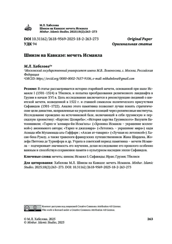 Цель исследования заключается в реконструкции сведений о шиитской мечети, возведенной в 1522 г. и ставшей символом политического присутствия Сафавидов (1501–1722).