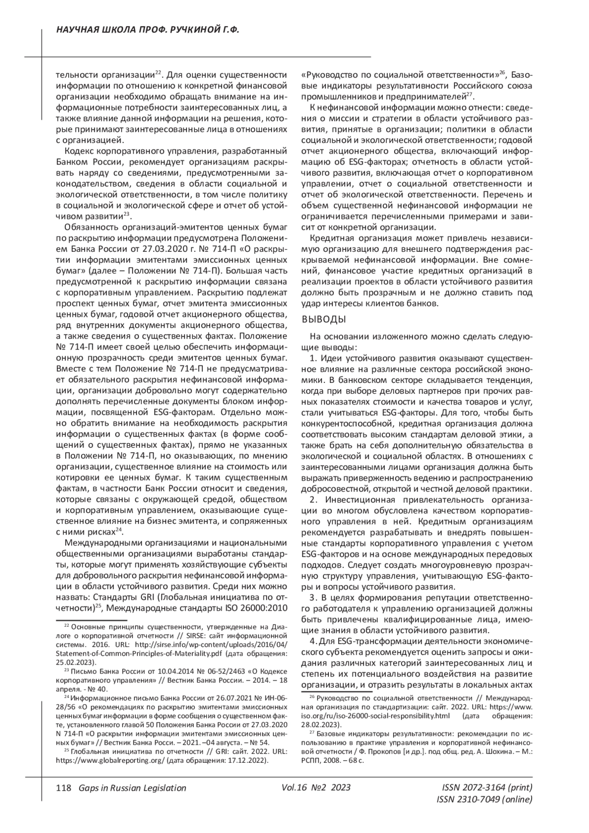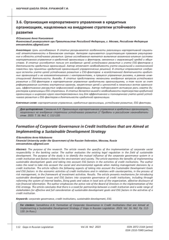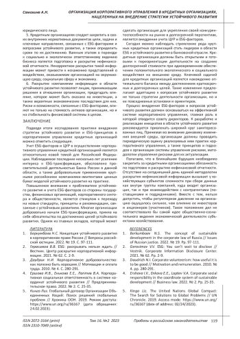 Статья: ОРГАНИЗАЦИЯ КОРПОРАТИВНОГО УПРАВЛЕНИЯ В КРЕДИТНЫХ ОРГАНИЗАЦИЯХ, НАЦЕЛЕННЫХ НА ВНЕДРЕНИЕ СТРАТЕГИИ УСТОЙЧИВОГО РАЗВИТИЯ (2023)