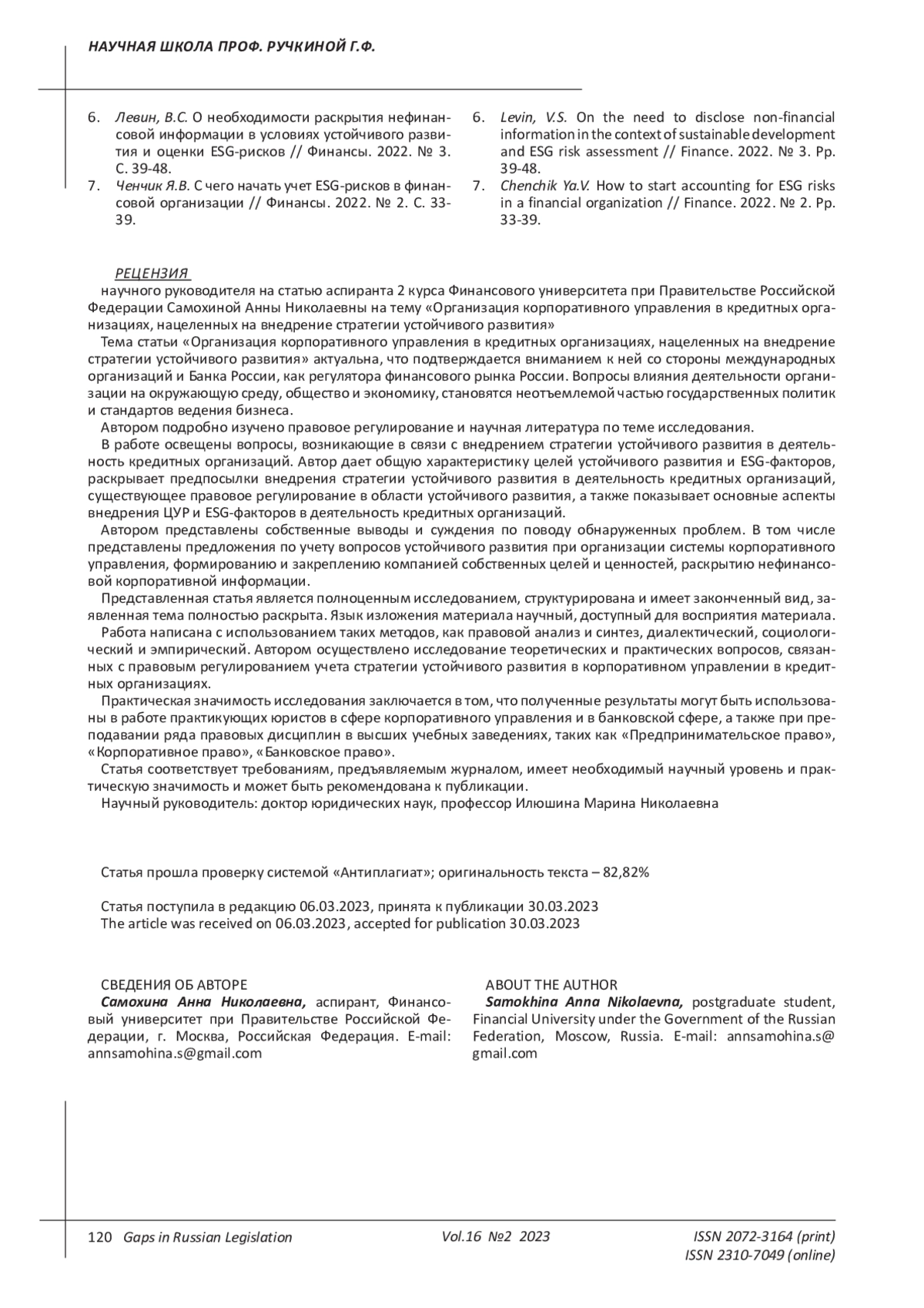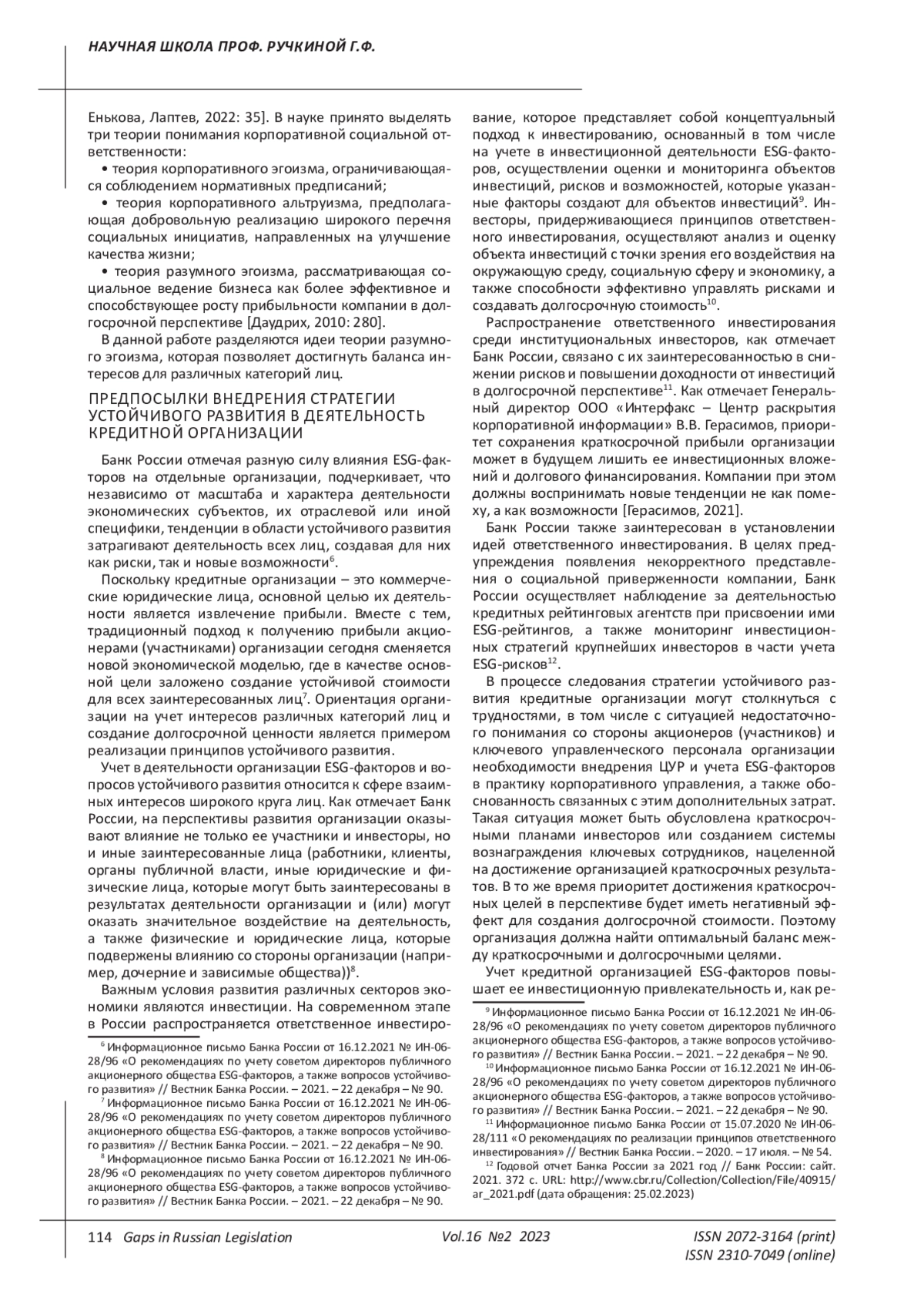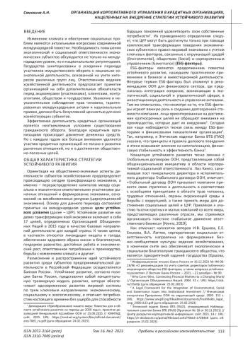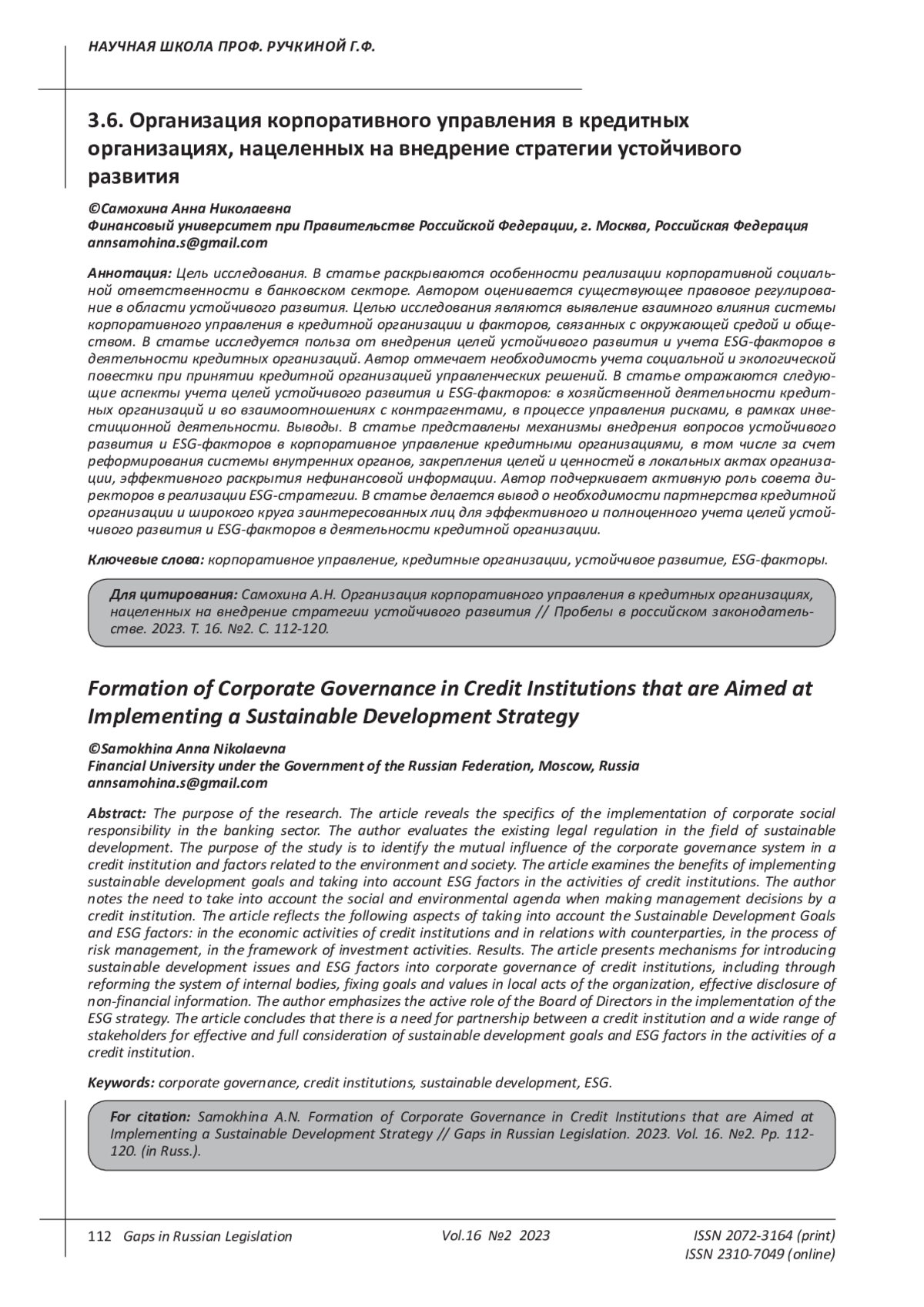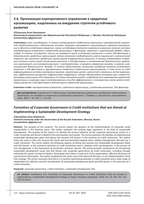 САМОХИНА А. Н. ОРГАНИЗАЦИЯ КОРПОРАТИВНОГО УПРАВЛЕНИЯ В КРЕДИТНЫХ ОРГАНИЗАЦИЯХ, НАЦЕЛЕННЫХ НА ВНЕДРЕНИЕ СТРАТЕГИИ УСТОЙЧИВОГО РАЗВИТИЯ // ПРОБЕЛЫ В РОССИЙСКОМ ЗАКОНОДАТЕЛЬСТВЕ. 2023. Т. 16 № 2