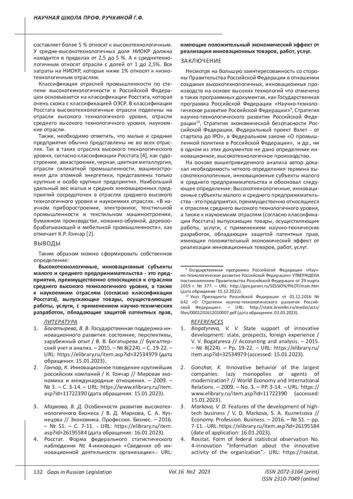 1. Богатырева, В. В. Государственная поддержка инновационного развития: состояние, перспективы, зарубежный опыт / В. В. Богатырева // Бухгалтерский учет и анализ. - 2015. - № 8(224). - С. 19-22. - URL: item.asp?id=32534979 (дата обращения: 15.01.2023). EDN: YQTYAC