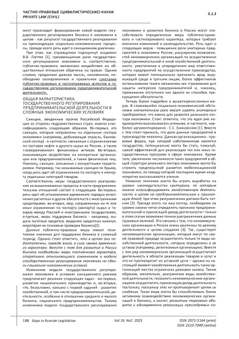Санкции, введенные против Российской Федерации со стороны недружественных стран, можно классифицировать следующим образом. Во-первых, это санкции, которые направлены на отдельные сектора экономики (например, добывающая отрасль, банковский сектор) - в частности, связанные с ограничениями по поставке нефти и другого сырья из России, а также «замораживание» финансовых активов. Во-вторых, оказывающие воздействие на конкретные организации или предпринимателей, а также физических лиц. Наконец, санкции, связанные с конкретными территориями. Например, так называемые санкции по Крыму, когда речь идет об ограничениях по экспорту и импорту отдельных категорий товаров. Соответственно, меры государственного реагирования на вышеназванные процессы в части предпринимательских отношений состоят в следующем. Во-первых, речь идет об установлении временного порядка исполнения расчетных и других обязательств с иностранными кредиторами, во-вторых, мер, направленных на те или иные ограничения по экспорту (импорту) сырья и товаров между Россией и иностранными государствами, в-третьих, меры поддержки бизнеса - например, выдача льготных кредитов, введение кредитных каникул, моратория на плановые проверки бизнеса[2].