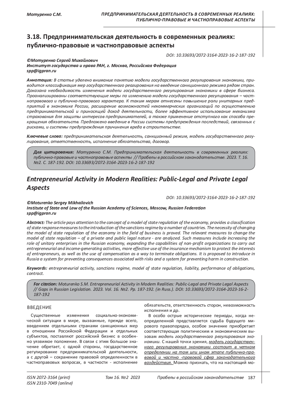 5. Проблемы развития и перспективы предпринимательского права в современных экономических условиях: монография / отв. ред. С.С. Занковский. М: Проспект, 2020. - 656 С. EDN: PFBNVF