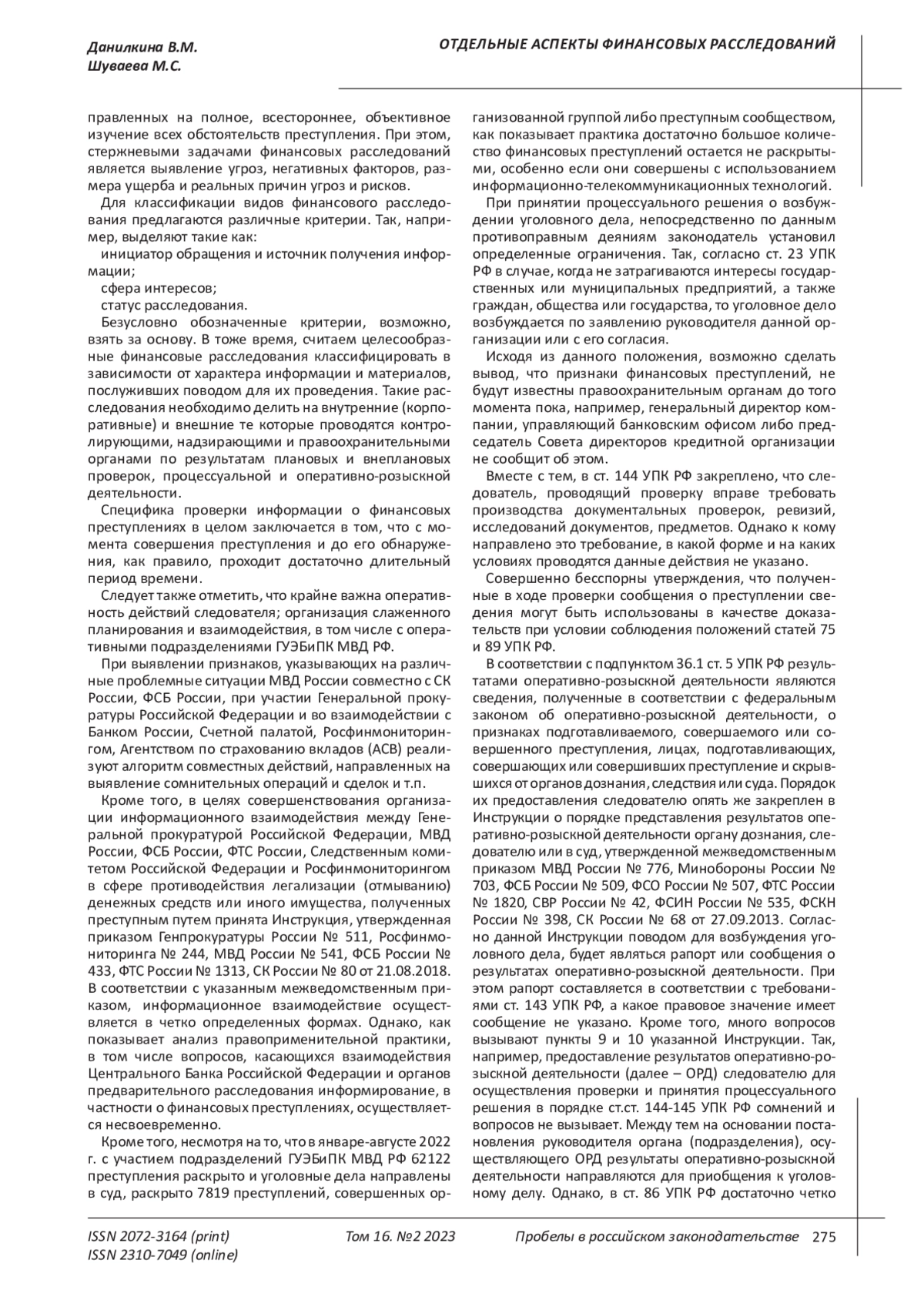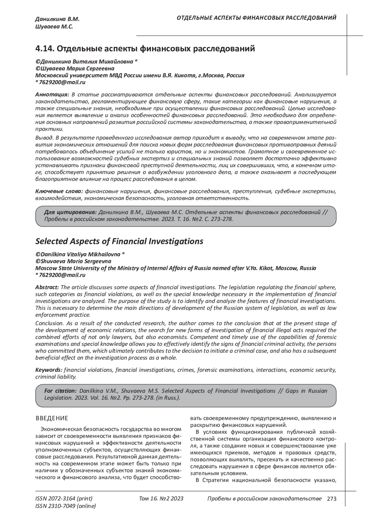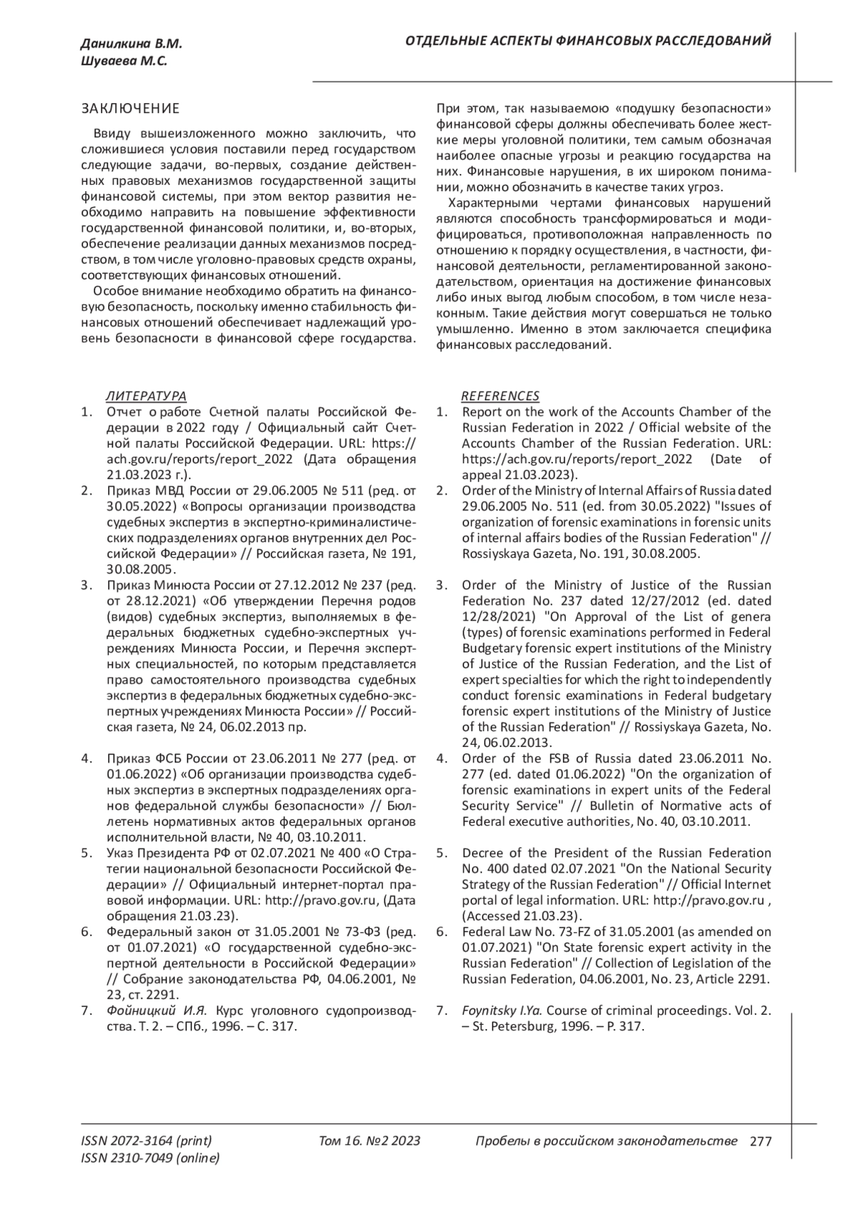 ДАНИЛКИНА В. М., ШУВАЕВА М. С. ОТДЕЛЬНЫЕ АСПЕКТЫ ФИНАНСОВЫХ РАССЛЕДОВАНИЙ // ПРОБЕЛЫ В РОССИЙСКОМ ЗАКОНОДАТЕЛЬСТВЕ. 2023. Т. 16 № 2