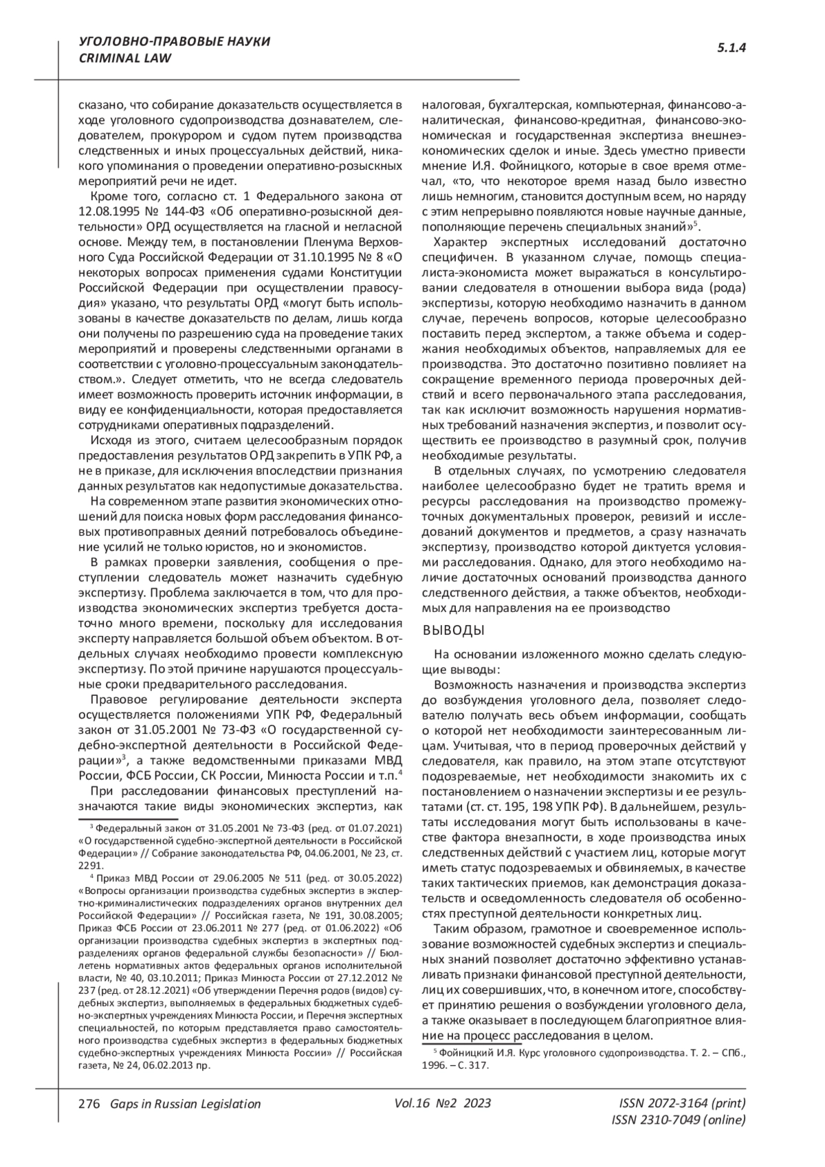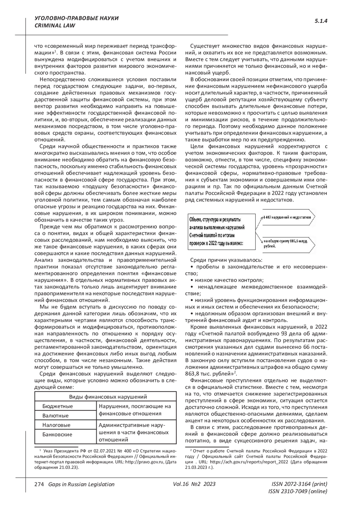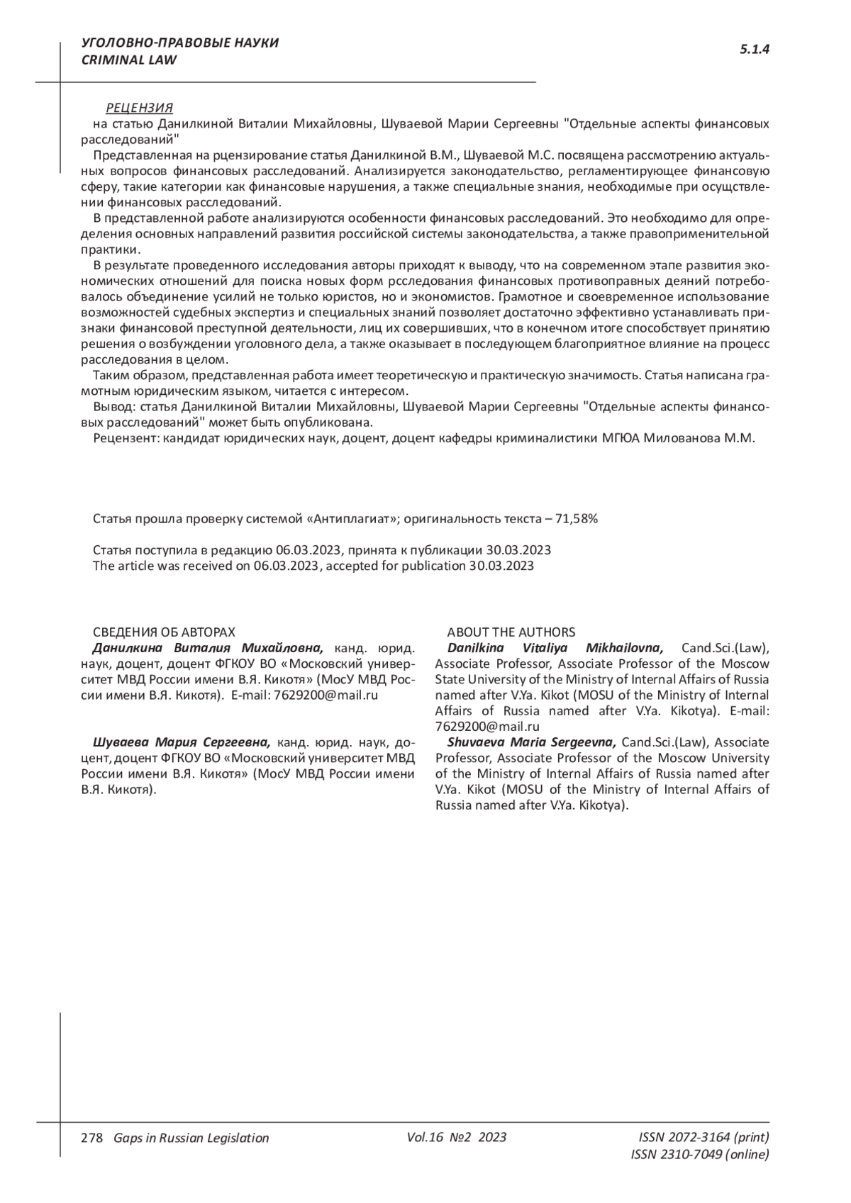ДАНИЛКИНА В. М., ШУВАЕВА М. С. ОТДЕЛЬНЫЕ АСПЕКТЫ ФИНАНСОВЫХ РАССЛЕДОВАНИЙ // ПРОБЕЛЫ В РОССИЙСКОМ ЗАКОНОДАТЕЛЬСТВЕ. 2023. Т. 16 № 2