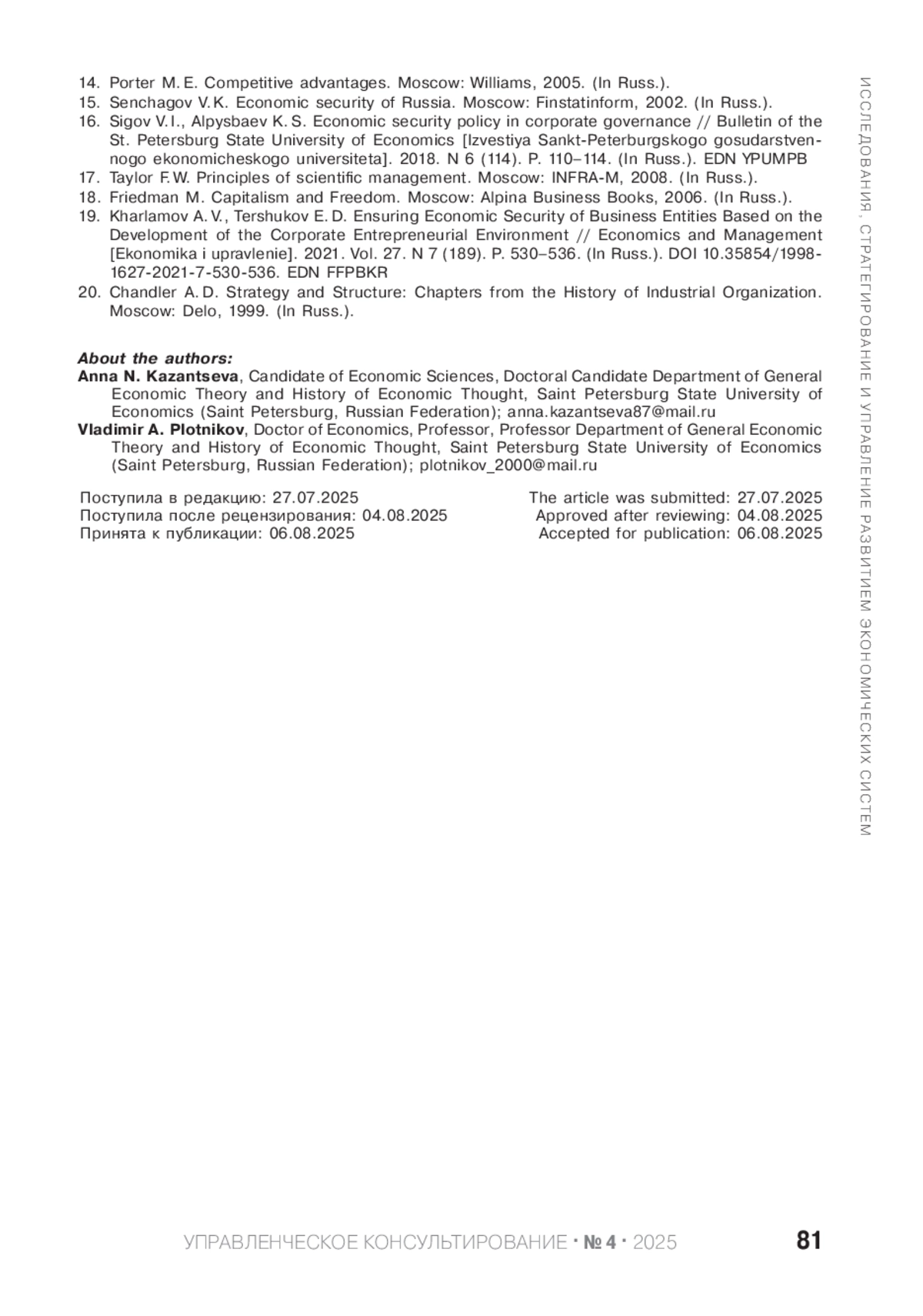 11. Плотников А.В., Ягунова Н. А. Обеспечение конкурентоспособности как основа экономической безопасности в условиях современной политико-экономической турбулентности // Технико-технологические проблемы сервиса. 2024. № 1 (67). С. 92-96.