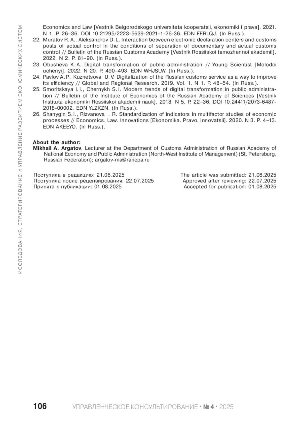 2. Аргатов М. А., Десятниченко О.Ю. Диспетчеризация таможенных деклараций: новые возможности и проблемы для участников ВЭД и ФТС России // Управленческое консультирование. 2023. № 8. C. 74-85. https://doi.org/10.22394/1726-1139-2023-8-74-85.