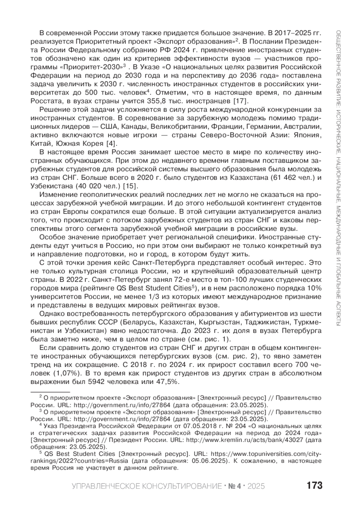 Актуальность темы определяется все возрастающим значением использования мягкой силы в международных отношениях. Одним из ее инструментов выступает экспорт образования. Анализ данных статистики вузов России за 2018–2024 гг. показывает, что несмотря на общий рост числа студентов из-за рубежа, доля обучающихся из стран СНГ1 сокращается. Хотя именно эти страны чаще всего рассматриваются в качестве основного источника зарубежных учебных мигрантов. В вузах Санкт-Петербурга фиксируются те же тренды.