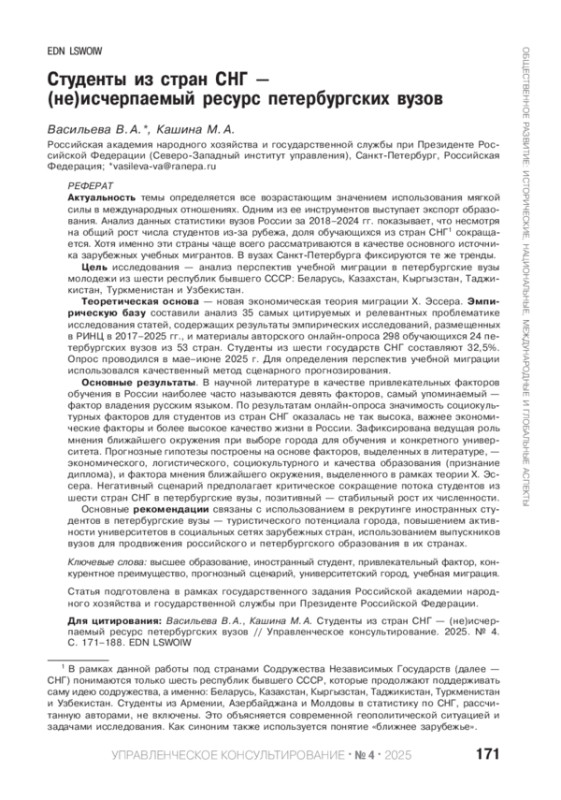Основные результаты. В научной литературе в качестве привлекательных факторов обучения в России наиболее часто называются девять факторов, самый упоминаемый — фактор владения русским языком. По результатам онлайн-опроса значимость социокультурных факторов для студентов из стран СНГ оказалась не так высока, важнее экономические факторы и более высокое качество жизни в России. Зафиксирована ведущая роль мнения ближайшего окружения при выборе города для обучения и конкретного университета. Прогнозные гипотезы построены на основе факторов, выделенных в литературе, — экономического, логистического, социокультурного и качества образования (признание диплома), и фактора мнения ближайшего окружения, выделенного в рамках теории Х. Эссера. Негативный сценарий предполагает критическое сокращение потока студентов из шести стран СНГ в петербургские вузы, позитивный — стабильный рост их численности.