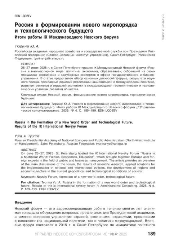 26–27 июня 2025 г. в Санкт-Петербурге прошел IX Международный Невский форум «Россия в многополярном мире: политика, экономика, образование», собравший на своих площадках российских и зарубежных экспертов в сфере государственного и бизнес-управления. В статье представлен обзор основных дискуссий форума, результаты научного поиска, прикладные решения реализации национальной и международной политики, развития регионов и отраслей экономики в складывающихся геополитических и технологических условиях развития общества.