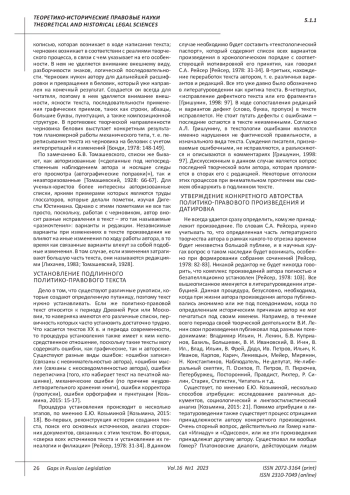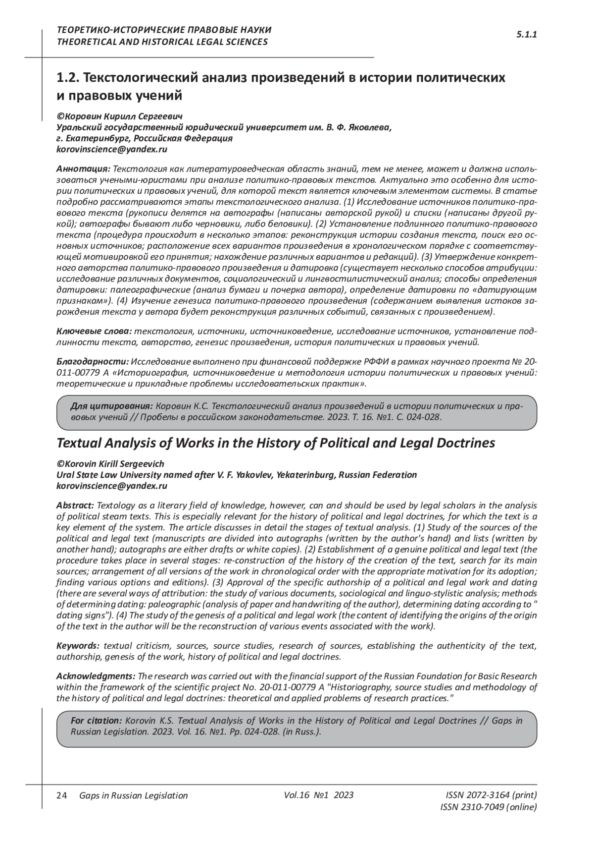 Текстология как литературоведческая область знаний, тем не менее, может и должна использоваться учеными-юристами при анализе политико-правовых текстов. Актуально это особенно для истории политических и правовых учений, для которой текст является ключевым элементом системы. В статье подробно рассматриваются этапы текстологического анализа. (1) Исследование источников политико-правового текста (рукописи делятся на автографы (написаны авторской рукой) и списки (написаны другой рукой); автографы бывают либо черновики, либо беловики). (2) Установление подлинного политико-правового текста (процедура происходит в несколько этапов: реконструкция истории создания текста, поиск его основных источников; расположение всех вариантов произведения в хронологическом порядке с соответствующей мотивировкой его принятия; нахождение различных вариантов и редакций). (3) Утверждение конкретного авторства политико-правового произведения и датировка (существует несколько способов атрибуции: исследование различных документов, социологический и лингвостилистический анализ; способы определения датировки: палеографические (анализ бумаги и почерка автора), определение датировки по «датирующим признакам»). (4) Изучение генезиса политико-правового произведения (содержанием выявления истоков зарождения текста у автора будет реконструкция различных событий, связанных с произведением).
