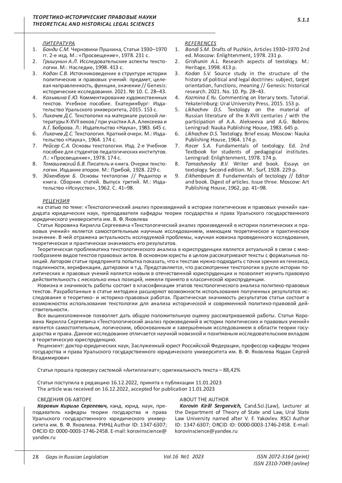 Юридическое источниковедение и текстология тесно взаимосвязаны между собой по причине сходного целеполагания. Как справедливо говорит С. В. Кодан, цель источниковедения в рамках истории политических и правовых учений – в создании теории, методологии и методики анализа источников познания государственно-правовой информации с применением опыта исследования текстов в социогуманитаристике [Кодан, 2021: 28-43]. В то время как текстология нацелена на обнаружение литературного предназначения памятника и выявление закономерностей и направлений развития; на погружение «в историю текста», определение тенденций и отражение процесса, рассмотрение явлений литературы согласно принципу историзма в их динамике, эволюции и взаимосвязях [Гришунин, 1998: 168]. Задачи текстологии, по С. А. Рейсеру, состоят в определении точного текста литературного произведения, кодификации текстов и последующем их комментировании [Рейсер, 1978: 10-12]. Получается, что равно, как история политических и правовых учений имеет текстологические задатки, так и текстология, рассматривающая литературные произведения в политико-правовом ключе, обладает свойствами, присущими «политученческой» истории, но в источниковедческом ракурсе.