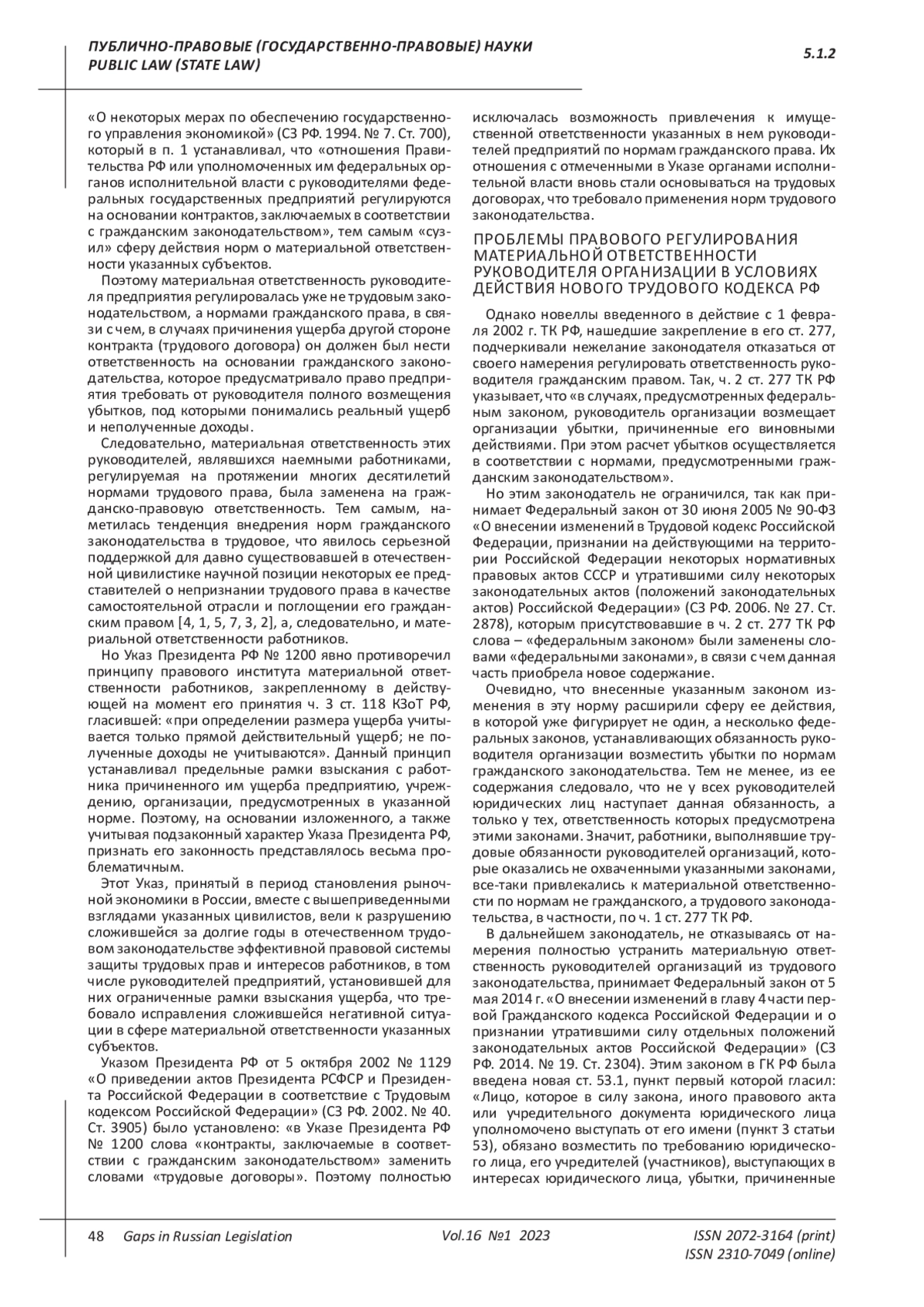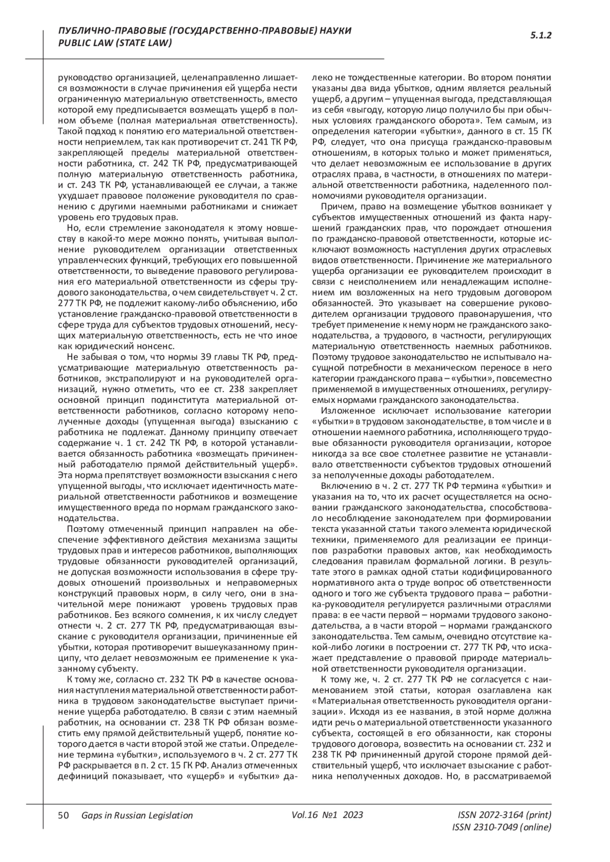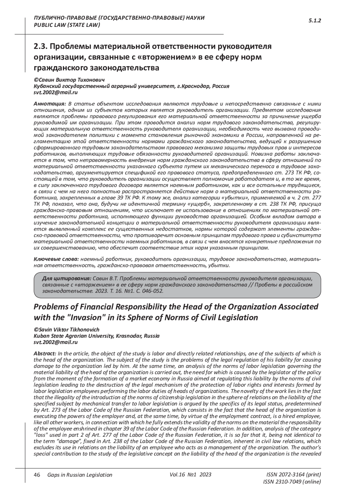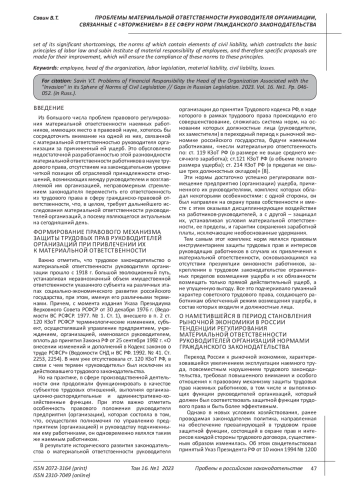 Savin V. T. Formation and development of labor legislation regulating the financial responsibility of the head of the organization // Gaps in Russian legislation. 2022. No. 5. p. 239. EDN: IGIISR