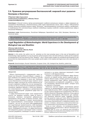 Область биотехнологий в современном мире набирает все больший и больший оборот с каждым годом. Особенно стал заметен скачок интереса к данной области в период пандемии и после нее. Насколько сильно биологически активный вирус поменял жизнь обычных людей, настолько же сильно изменилась реальность правового сообщества, так как законодательная база не была готова для регулирования правового положения подобных вирусов, а также для применения ответственности к виновным в распространении серьезной лабораторной разработки среди масс населения Земли.