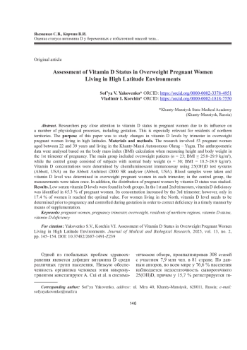 Материалы и методы. В исследовании приняли участие 53 беременных в возрасте от 22 до 39 лет, проживающих в Ханты-Мансийском автономном округе - Югре. Анализ антропометрических данных производился на основании расчета индекса массы тела (ИМТ) при измерении роста и массы тела в I триместре беременности. Основную группу составили пациентки с избыточной массой тела (n = 23; ИМТ ≥ 25,0-29,9 кг/м²), в качестве контроля выступали обследуемые с нормальной массой тела (n = 30; ИМТ = 18,5-24,9 кг/м²). Концентрация витамина D определялась методом иммунохемилюминесцентного анализа с использованием тест-систем 25(ОН)D (Abbott, США) на анализаторе Abbott Architect i2000 SR (Abbott, США). Забор крови и определение уровня данного витамина у беременных с избыточной массой тела осуществлялись в каждом триместре, в контрольной группе измерения проводились однократно. Также изучалось распределение беременных по уровню обеспеченности витамином D.