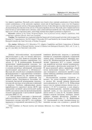 Результаты. Средний уровень двигательной активности выявлен у половины обследованных (56,3 %), доли студентов с низким и высоким уровнями двигательной активности были почти равны (19,7 и 24,0 % соответственно). Оценивались показатели адаптации по методу Р. М. Баевского и по данным спектрального анализа вариабельности сердечного ритма, что позволило установить положительное влияние физической активности на адаптационные возможности студентов. У испытуемых, ведущих малоподвижный образ жизни, определены высокая активность симпатического отдела, преобладание центрального контура регуляции и низкочастотных волн над высокочастотными в клино- и ортоположении, несбалансированный состав тела, характеризующийся снижением активной клеточной массы и содержания воды на фоне избыточной жировой массы тела, что свидетельствует о низких адаптационных возможностях. У физически активных студентов определены минимальная централизация управления сердечным ритмом, преобладающее влияние автономного контура регуляции и высокочастотных волн над низкочастотными, более высокая активность парасимпатического отдела. При ортостатической пробе снижение общей мощности спектра у них происходило на фоне уменьшения активности парасимпатического отдела. Физически активные студенты имели более низкие значения жировой массы тела и более высокие показатели активной клеточной массы, воды и общего обмена веществ. У них преобладали хорошие и высокие индексы компонентного состава тела, что способствовало поддержанию адаптационного потенциала на высоком уровне.