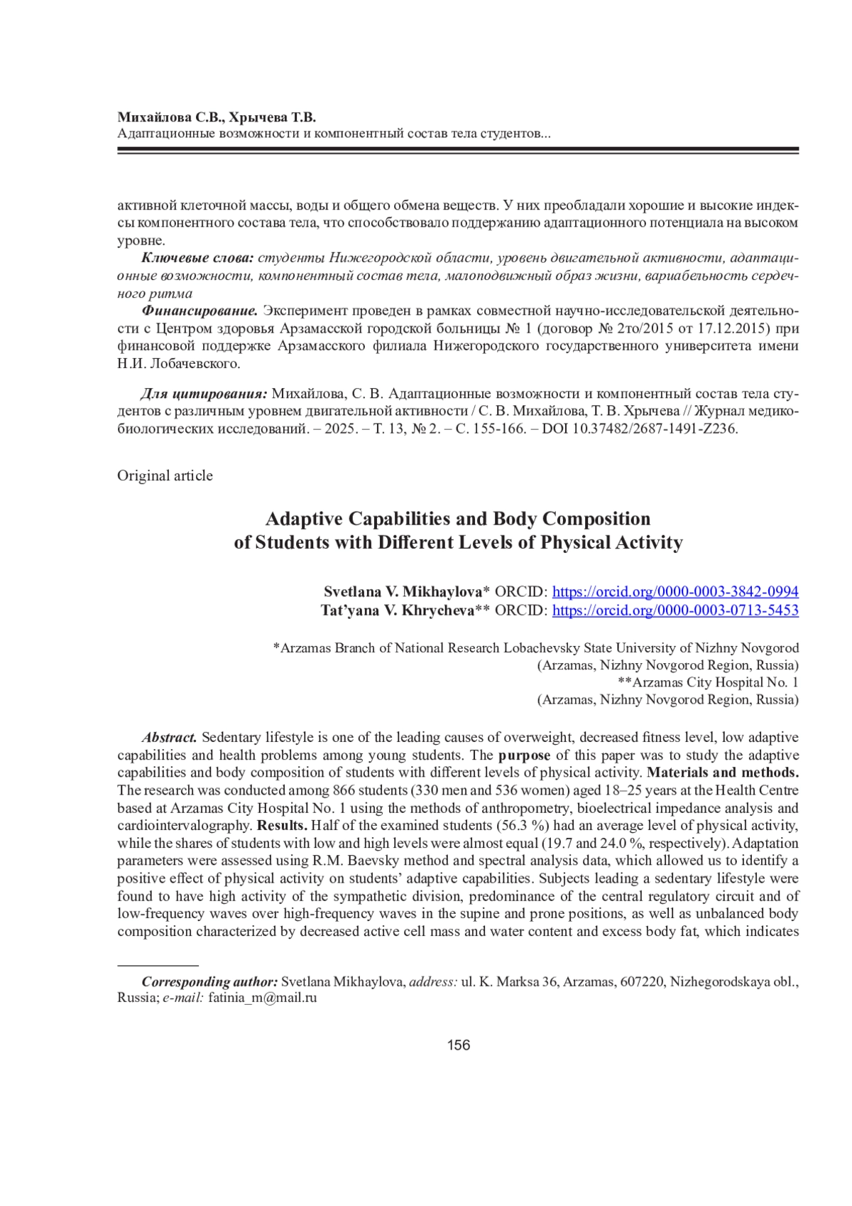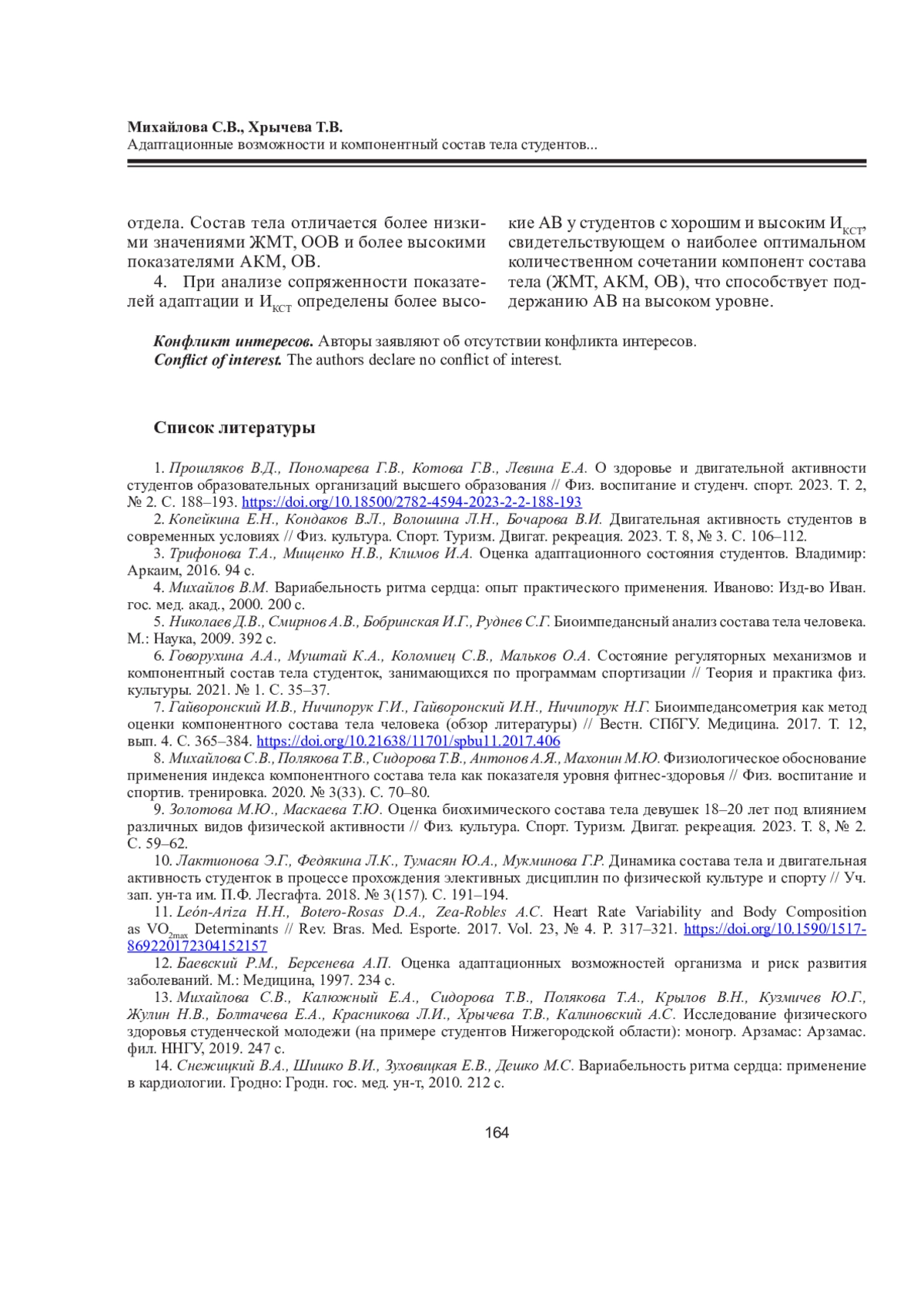 13. Михайлова С.В., Калюжный Е.А., Сидорова Т.В., Полякова Т.А., Крылов В.Н., Кузмичев Ю.Г., Жулин Н.В., Болтачева Е.А., Красникова Л.И., Хрычева Т.В., Калиновский А.С. Исследование физического здоровья студенческой молодежи (на примере студентов Нижегородской области): моногр. Арзамас: Арзамас. фил. ННГУ, 2019. 247 с. EDN: ZXQYNO