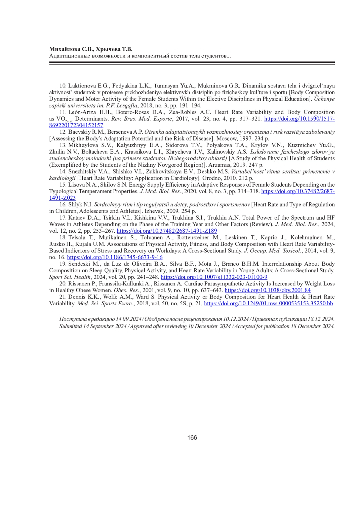 19. Sendeski M., da Luz de Oliveira B.A., Silva B.F., Mota J., Branco B.H.M. Interrelationship About Body Composition on Sleep Quality, Physical Activity, and Heart Rate Variability in Young Adults: A Cross-Sectional Study // Sport Sci. Health. 2024. Vol. 20. P. 241-248. DOI: 10.1007/s11332-023-01100-9 EDN: QHCAEB